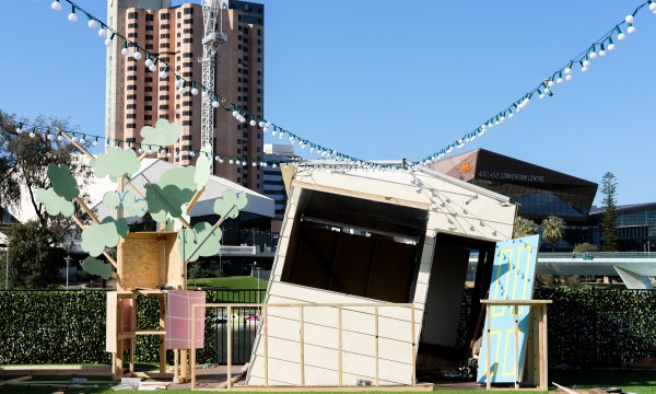 At the back of the space sits a semi-sunken cubby house that will house the deejay; a yellow tin shed will host GANG GANG, who are on board to provide food; Peter Rabbit have wheeled on their caravan and will be taking care of cocktails and coffee, which will complement the offering of the Red Bull house bar; and above the lawn chairs and tables is the Mismatch basketball ring.