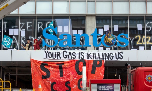 Last Wednesday, six members of Extinction Rebellion SA glued themselves to Flinders Street and scaled the awning of Santos’ headquarters.