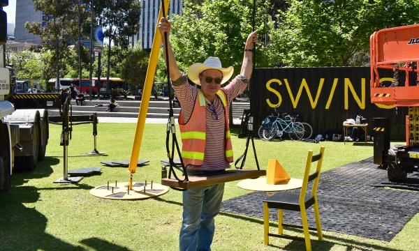 Ian created the swing and will take it around Australia to encourage play in public spaces, noting the knock-on effects playing has on our quality of life.