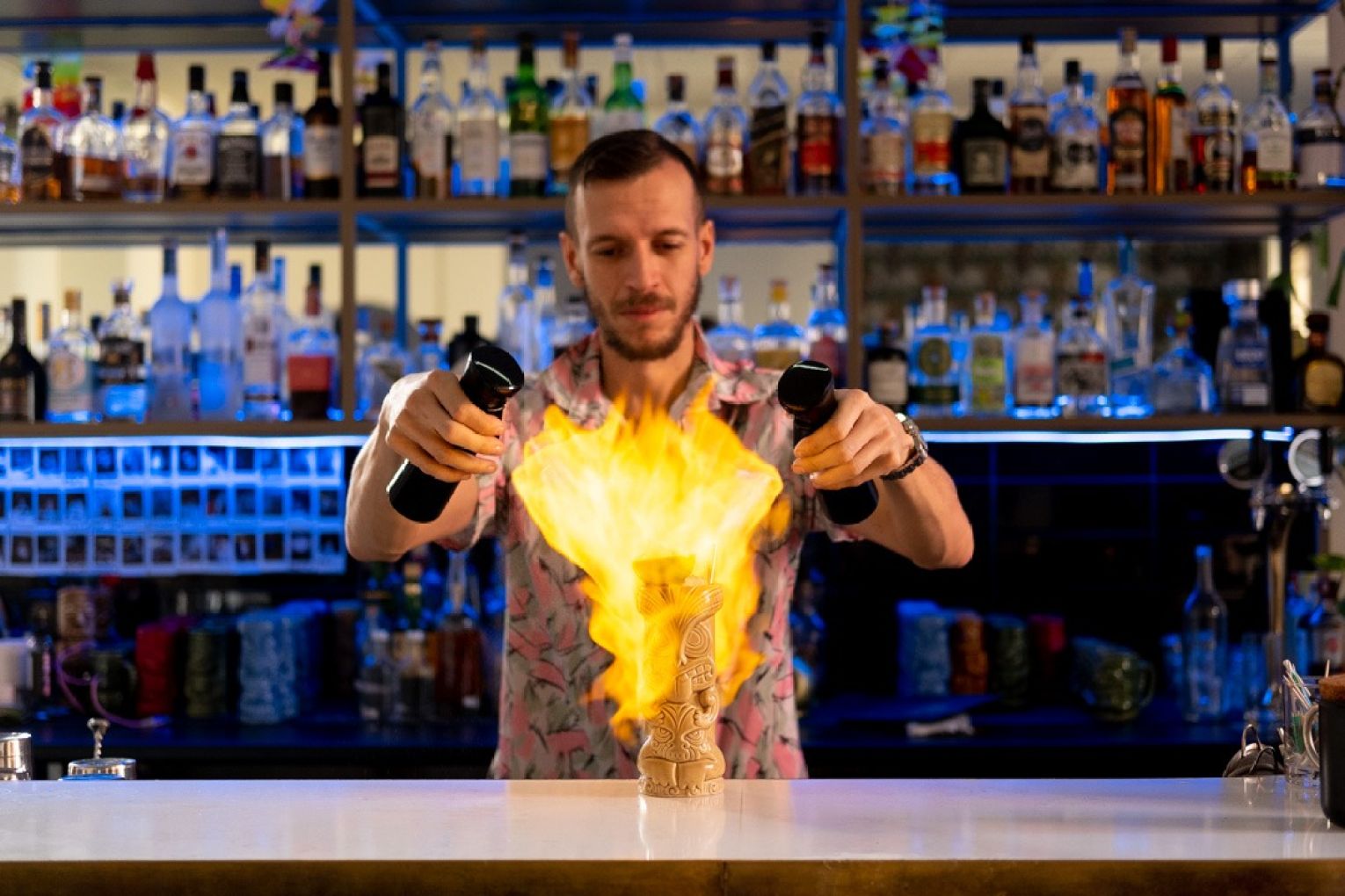 “[High Spirits uses a] specialty spray bottle that sprays a really fine mist filled with over-proof rum, and it gives us the ability to shoot flames… off the tops of drinks.”