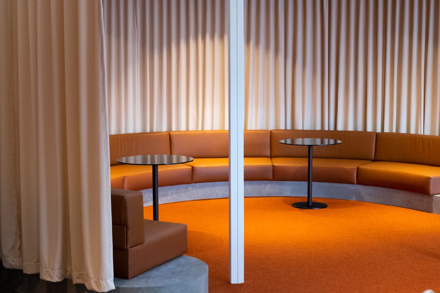 The space is full of soft pastels, with predominant warm, apricot tones. The design is also soft in its edges, with circular shapes repeated throughout the space.