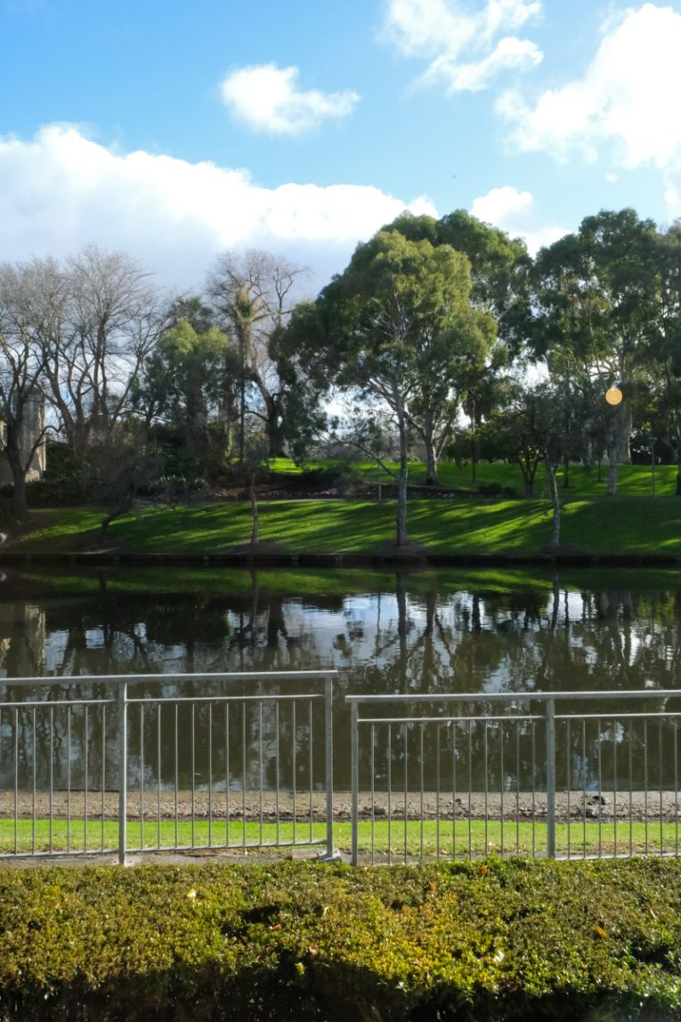 At 8:30am the sun shines brightly on the still River Torrens, glistening ripples moving slowly across the water.