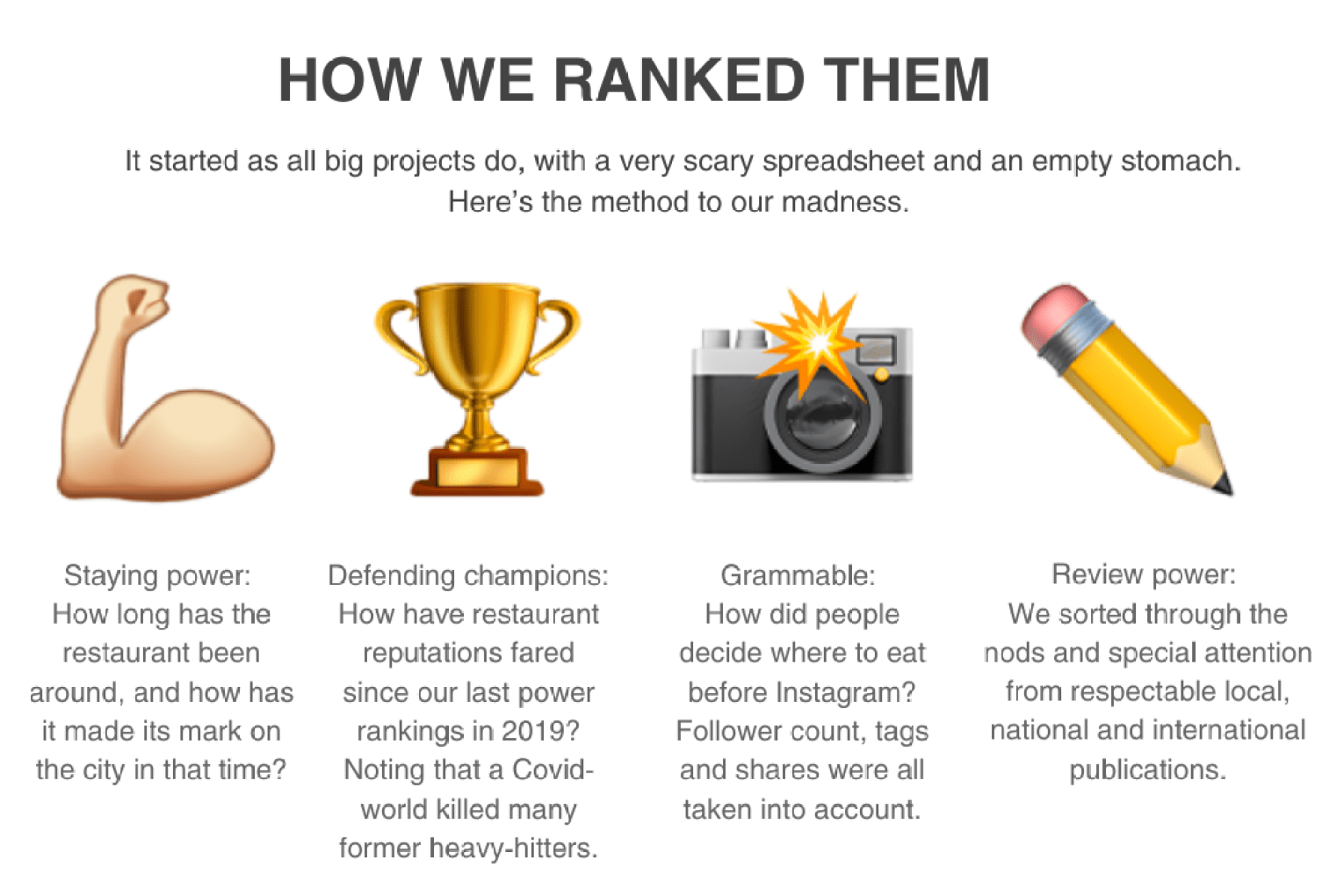 Beginning with a shortlist of 50 spots, we whittled it down using a judging matrix considering word of mouth, appeal across age groups, traditional media coverage, critical acclaim, social media influence and our own gut reactions (pun intended).