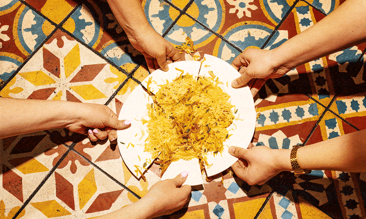 The Narenj Palaw, a long-grain rice with candied orange peelings, slivered almonds and pistachio is what you see spilling across our cover. We have yet to find a rice as delicious and vibrant as this one.