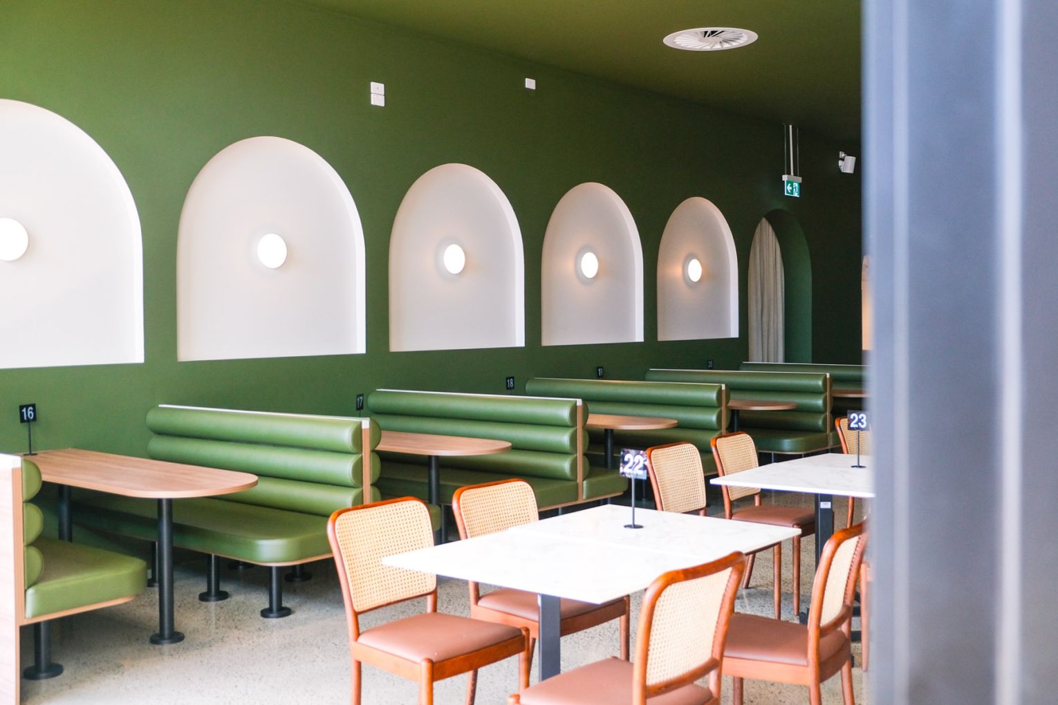 The space is also versatile in its choice of interiors, with forest green walls and couches filling the space, designed by Natasha Banhalmi of Snow Studio.