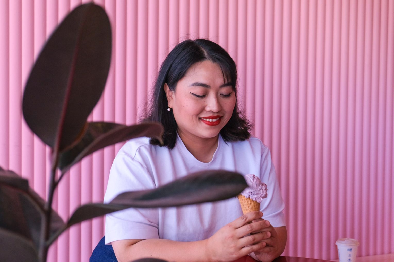 “So red ceiling, pink walls, just really leaning into it, and then just playing with textures as well. Our mochi donuts are curved, hence the walls are also curved.