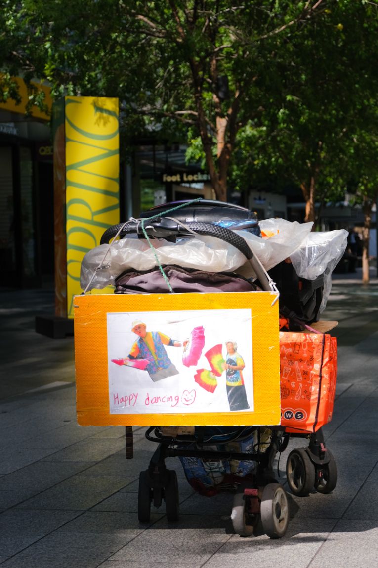 Beside Bobo at every performance is a small blue carry-on suitcase for donations and a stroller packed to the brim with her belongings; a speaker, shopping bags, a tarp for when it rains, a worn children’s pram toy and, of course, her white cardboard sign hanging from the stroller’s handle. It’s this sign, accompanied by a picture of Max, is how most of Adelaide knows her story.