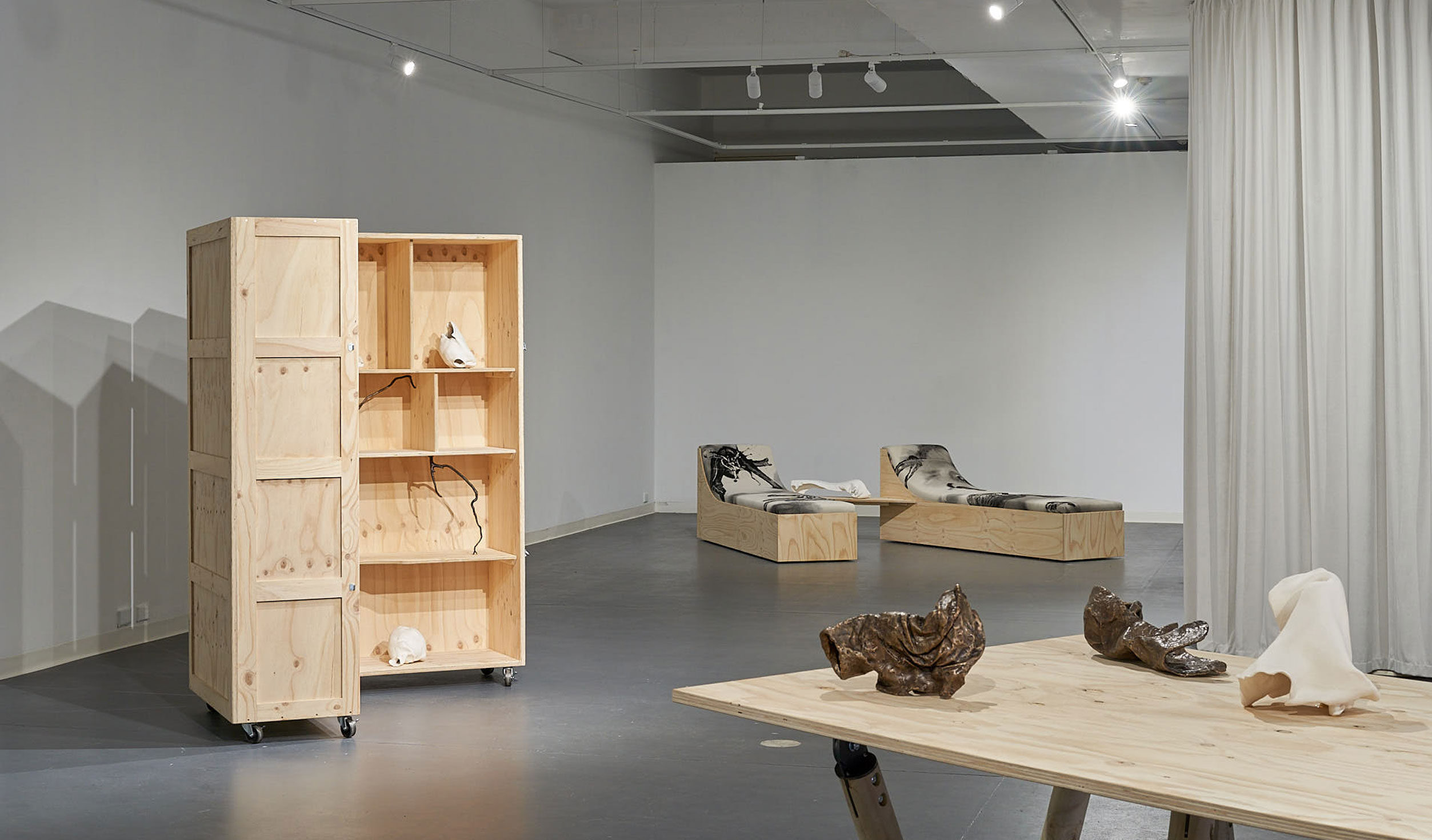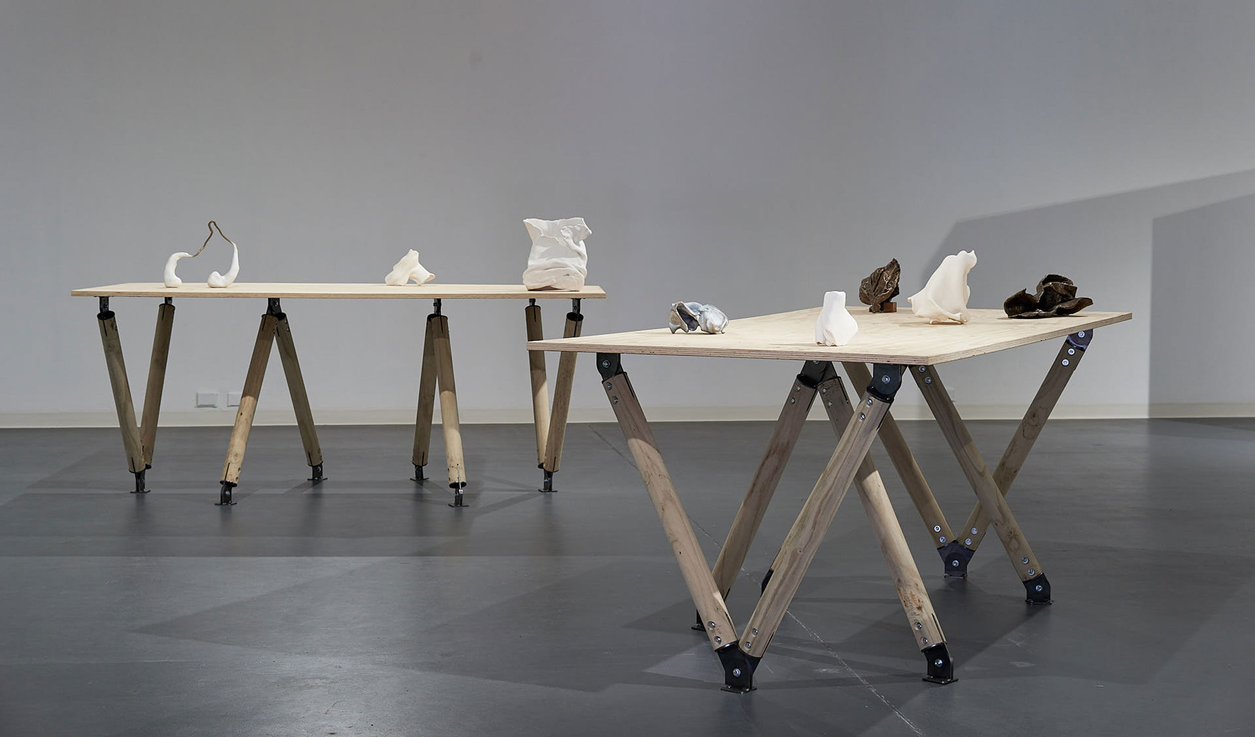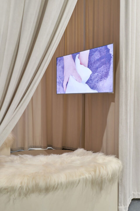 Message from the meadow is an immersive and experiential exploration into how artworks can trigger a sensory effect. The outcome of ACE Open’s inaugural Porter Street Commission, the exhibition reflects the ecosystem of a meadow through organic sculptural forms, specially-designed furniture, an intimate four-channel sound work and Bridget Currie’s video work, soft insides.