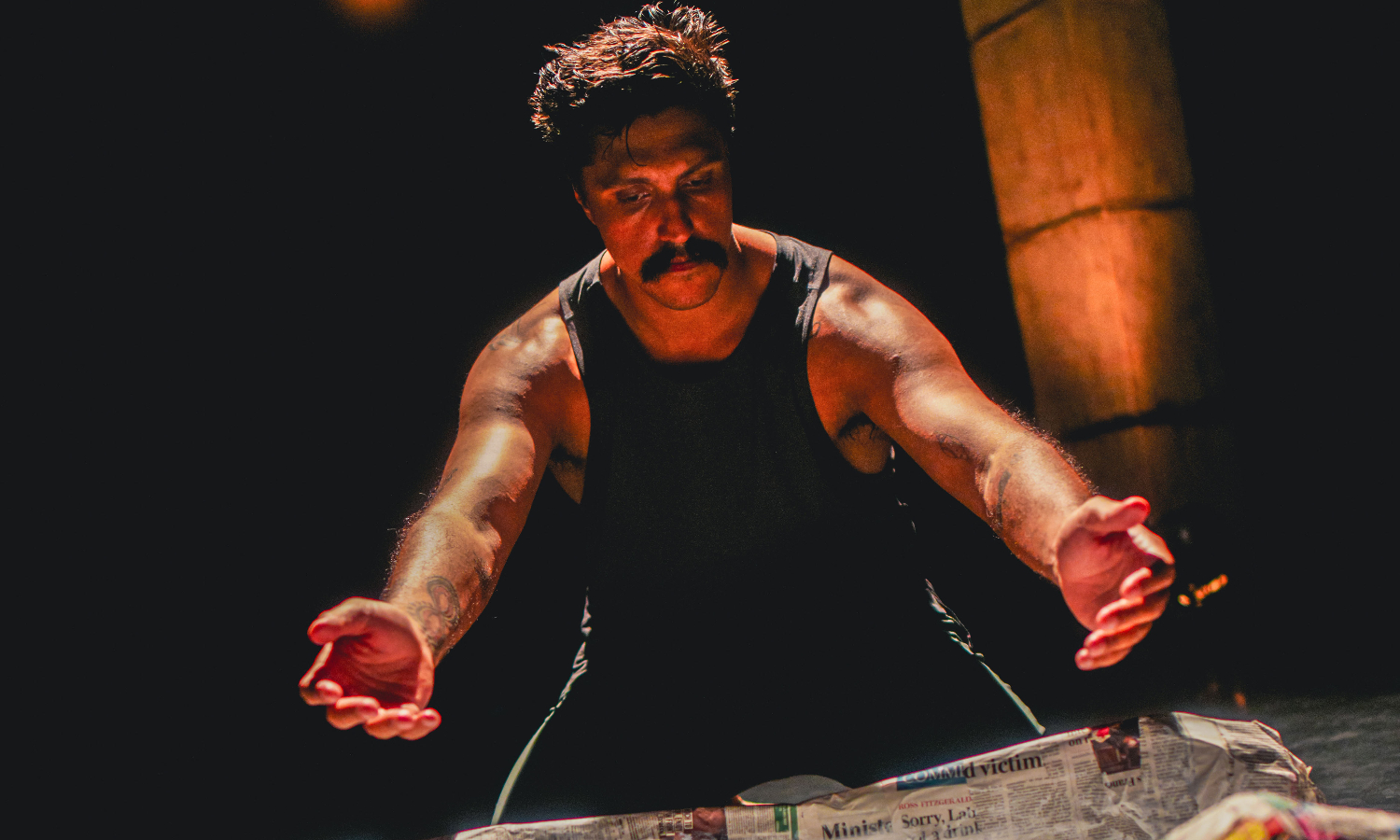 At the end of Kuramanunya, performer and choreographer Thomas ES Kelly – a Minjungbal-Yugambeh, Wiradjuri and Ni-Vanuatu man – steps forward to directly address the audience.