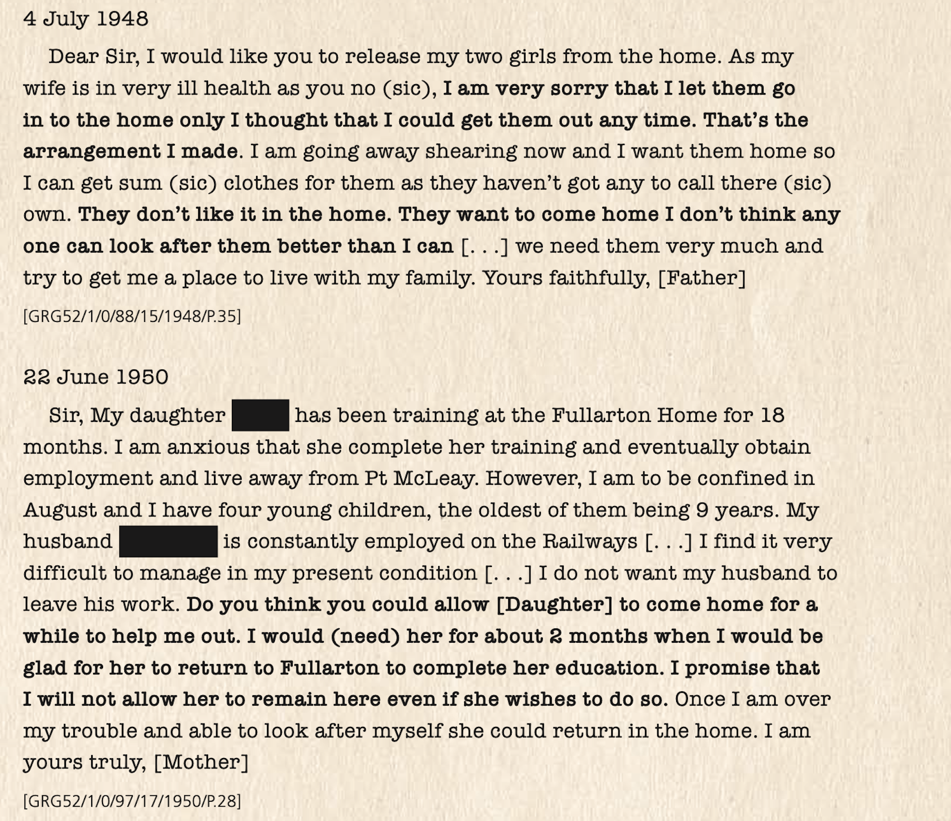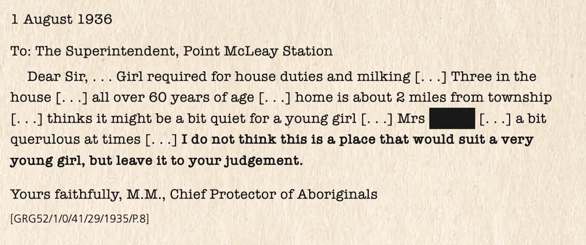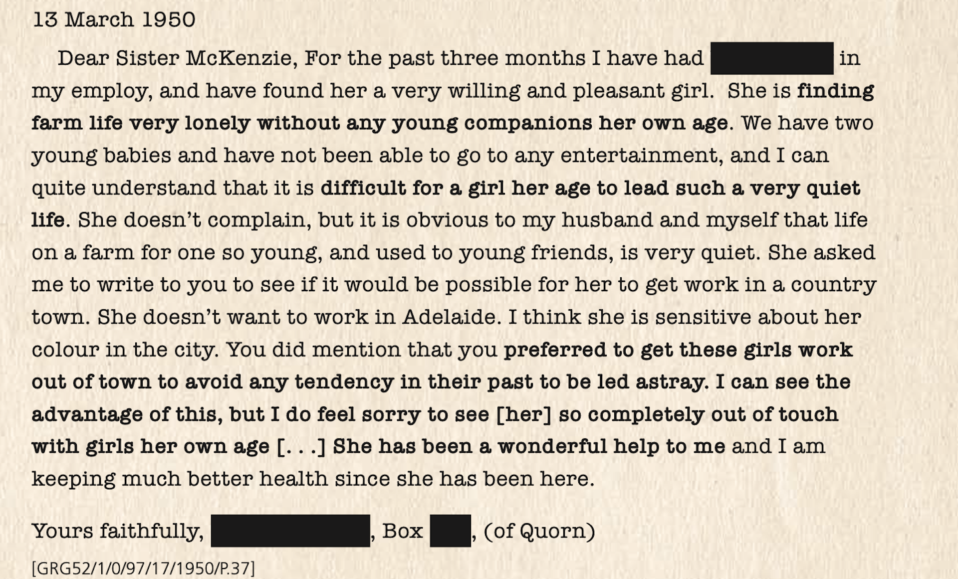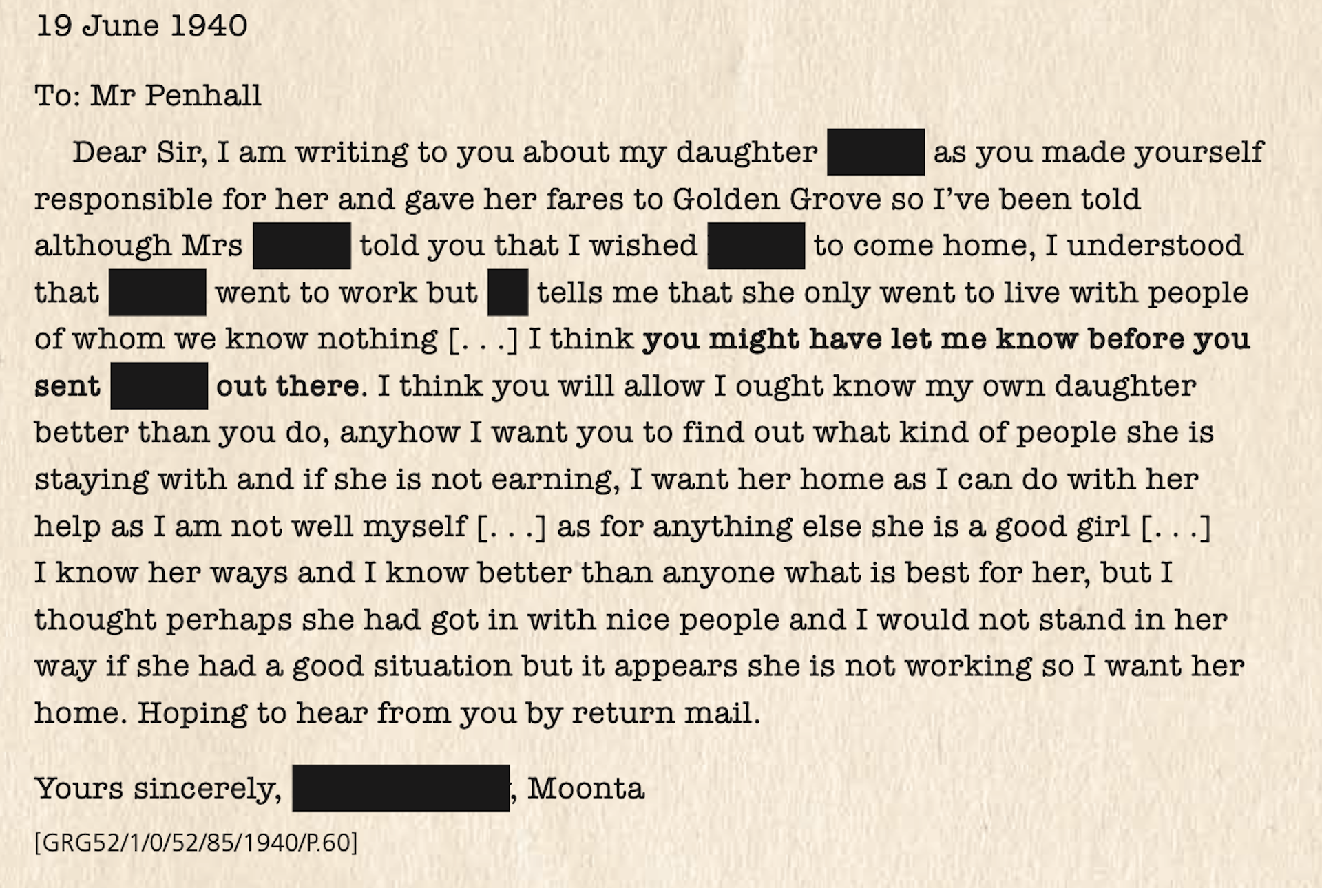 The diversity of experiences in domestic service situations are represented best in the words of women and girls themselves. Their letters to families, state authorities and employers reveal the intimate day-to-day machinations of state that controlled their lives in gendered and racialised ways. Collectively, these letters represent an accidental record on the archive to verify a much larger and hidden labour story in South Australia.