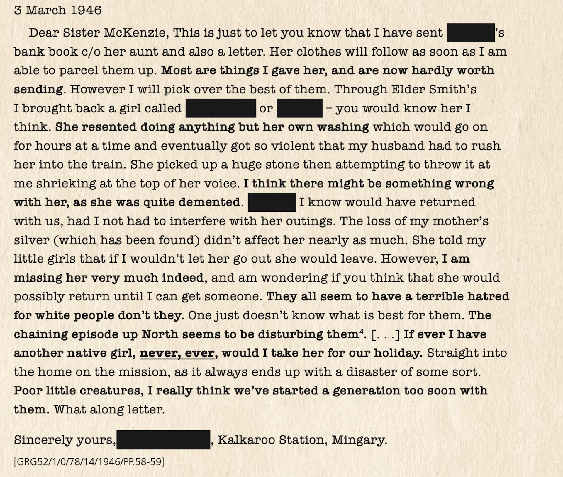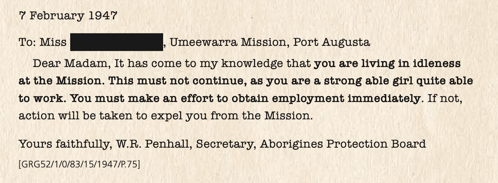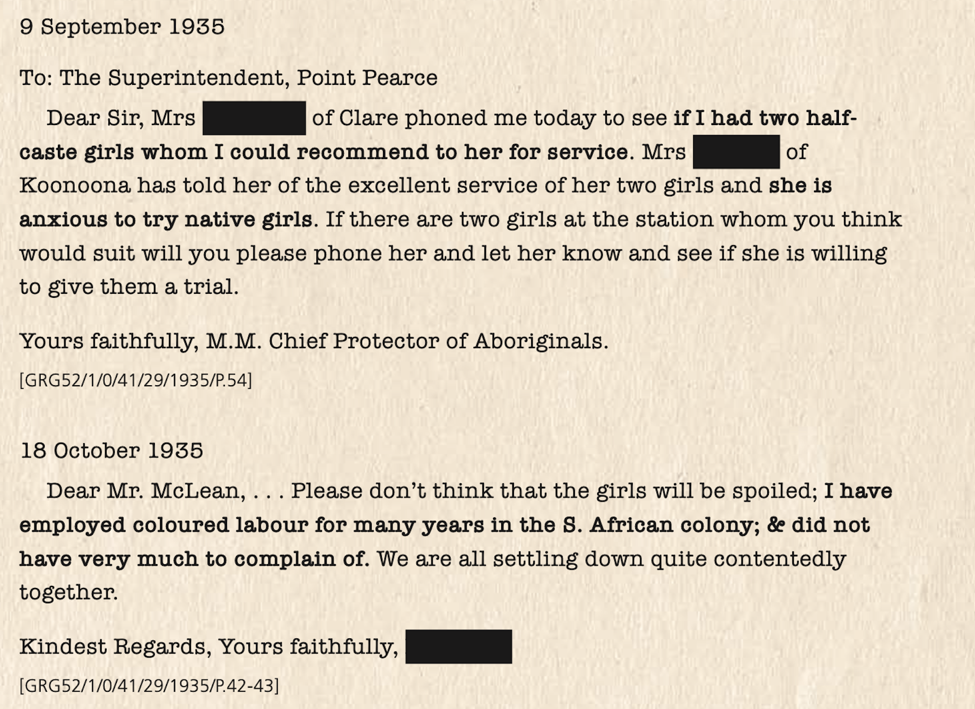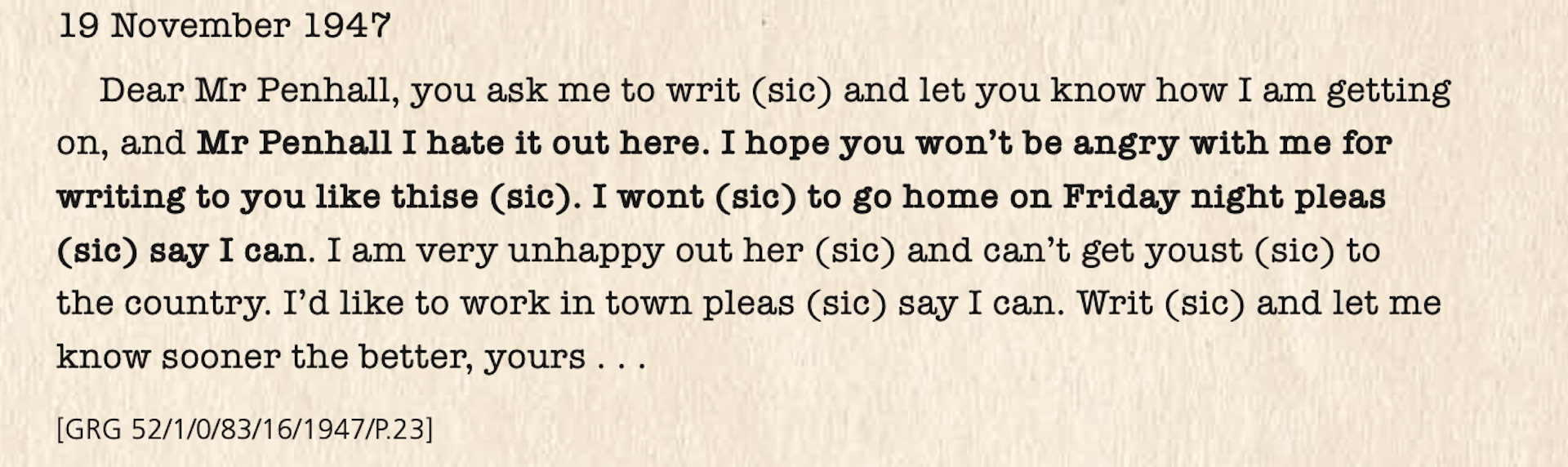 The diversity of experiences in domestic service situations are represented best in the words of women and girls themselves. Their letters to families, state authorities and employers reveal the intimate day-to-day machinations of state that controlled their lives in gendered and racialised ways. Collectively, these letters represent an accidental record on the archive to verify a much larger and hidden labour story in South Australia.