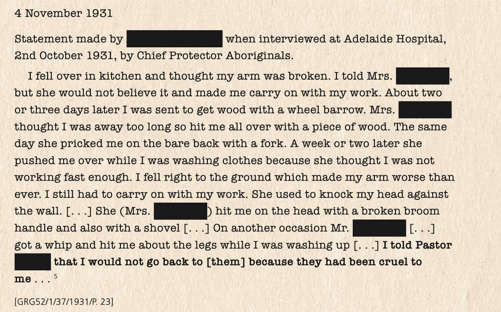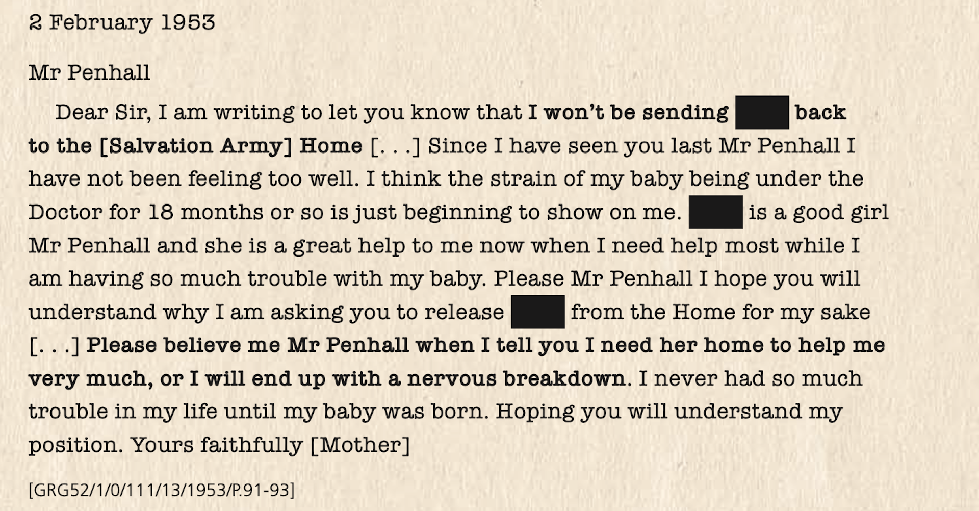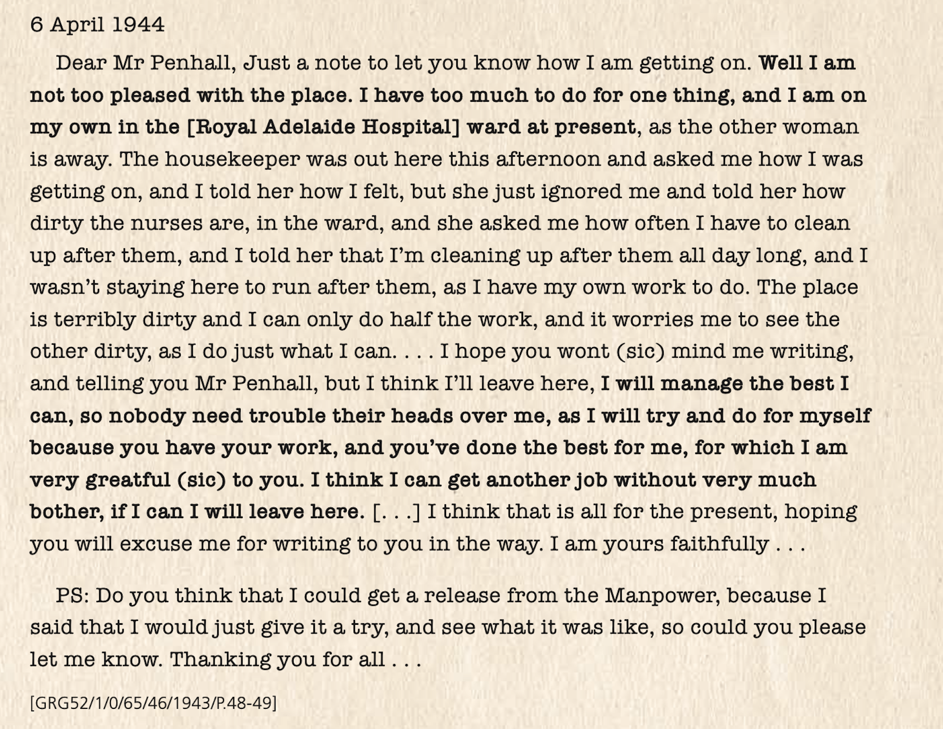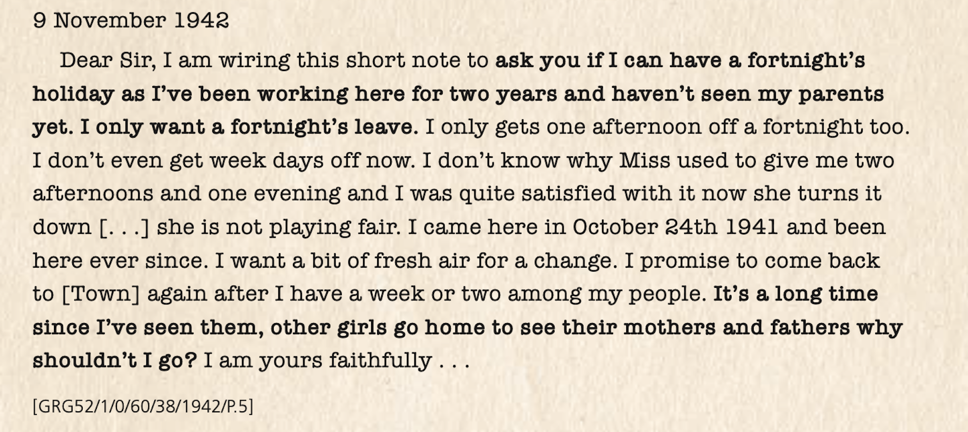 The diversity of experiences in domestic service situations are represented best in the words of women and girls themselves. Their letters to families, state authorities and employers reveal the intimate day-to-day machinations of state that controlled their lives in gendered and racialised ways. Collectively, these letters represent an accidental record on the archive to verify a much larger and hidden labour story in South Australia.
