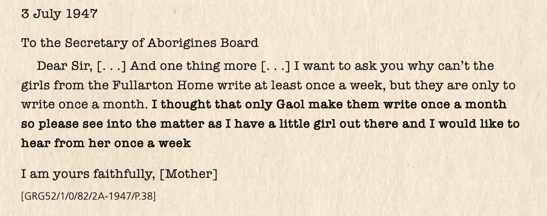 At the Fullarton Girls Home, all family correspondence was directed initially to the Protector, then the matron, then the girls. Their reply was overseen by the matron, and sometimes via the Protector. The matron was very prescriptive about outings and what time the girls could be collected and returned, with no allowance for spontaneity or flexibility.