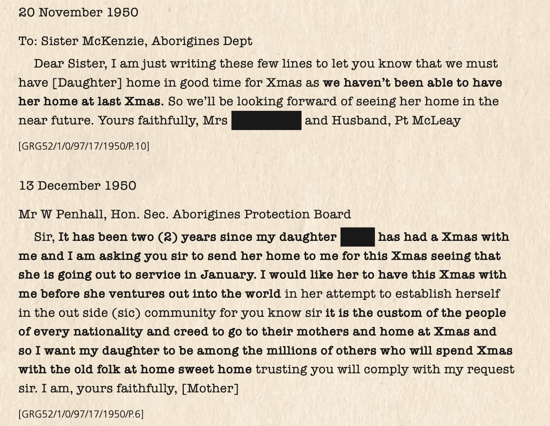All correspondence between a parent and child or parent and employer was mediated through the Aborigines Department and Chief Protector, and the girls often did not receive them. These letters and the people who wrote them are extraordinary, and provide a critical insight to Aboriginal agency, resistance, and strategic proactive engagement with authorities.