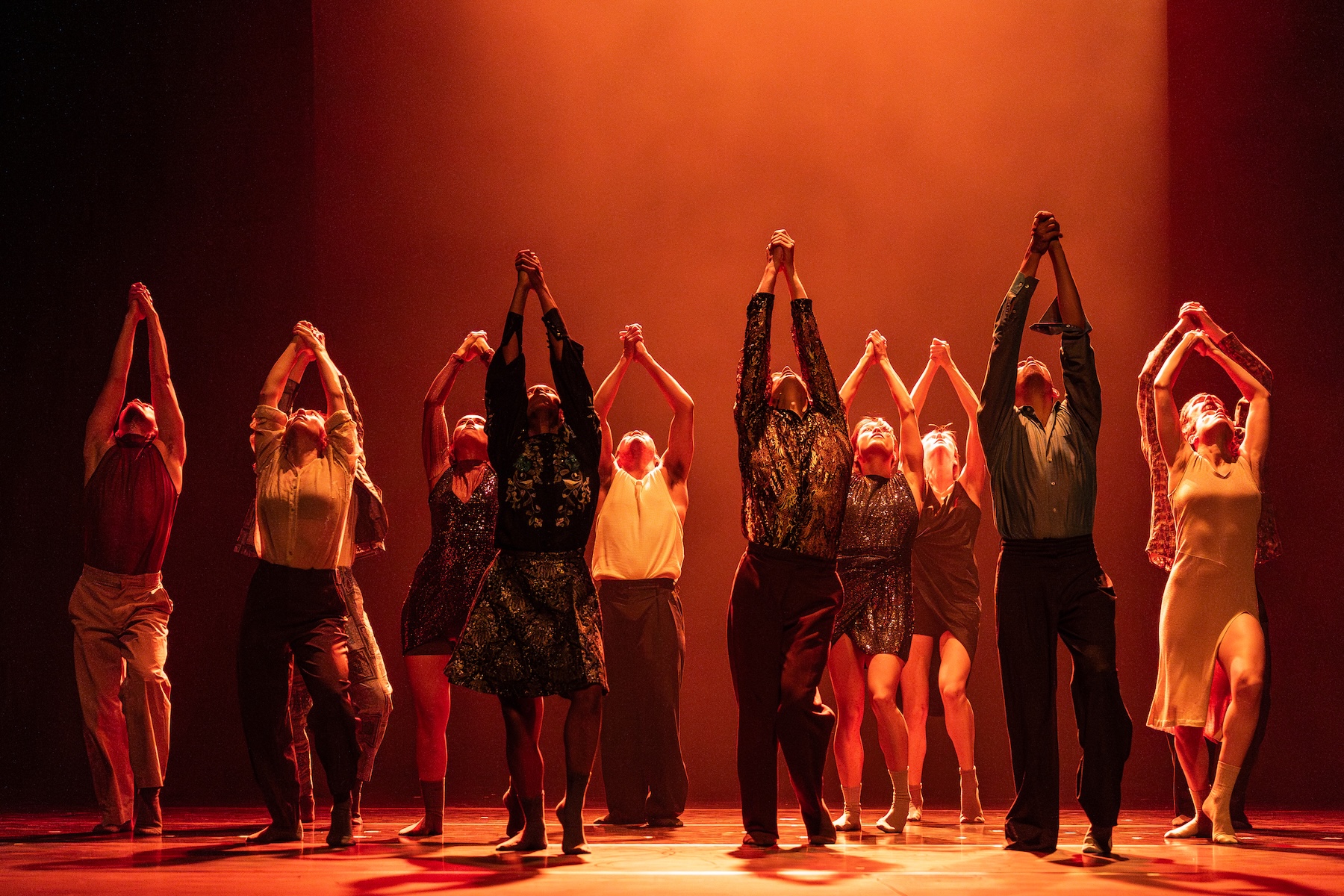 Theatre of Dreams is Schechter’s second work to be presented at the Adelaide Festival. The first, Grand Finale, which was rapturously received here in 2019, shares elements with this performance, though to different effect. There is Schechter’s immersively loud and dynamic soundscape which in turn drives the dancers into a primal, ecstatic frenzy with the 120bpm of a techno club, slows them into dreamy interludes of nostalgic old songs or transports them into joyful, synchronised folk-style dances. There is Tom Visser’s magnificent lighting design which, together with Schechter’s soundtrack, intensifies the atmosphere of whatever is happening on stage. Then there is the framing device, which in Grand Finale is accomplished by boxes that contain or separate the dancers, inviting feelings of division, isolation, or communal ecstasy.