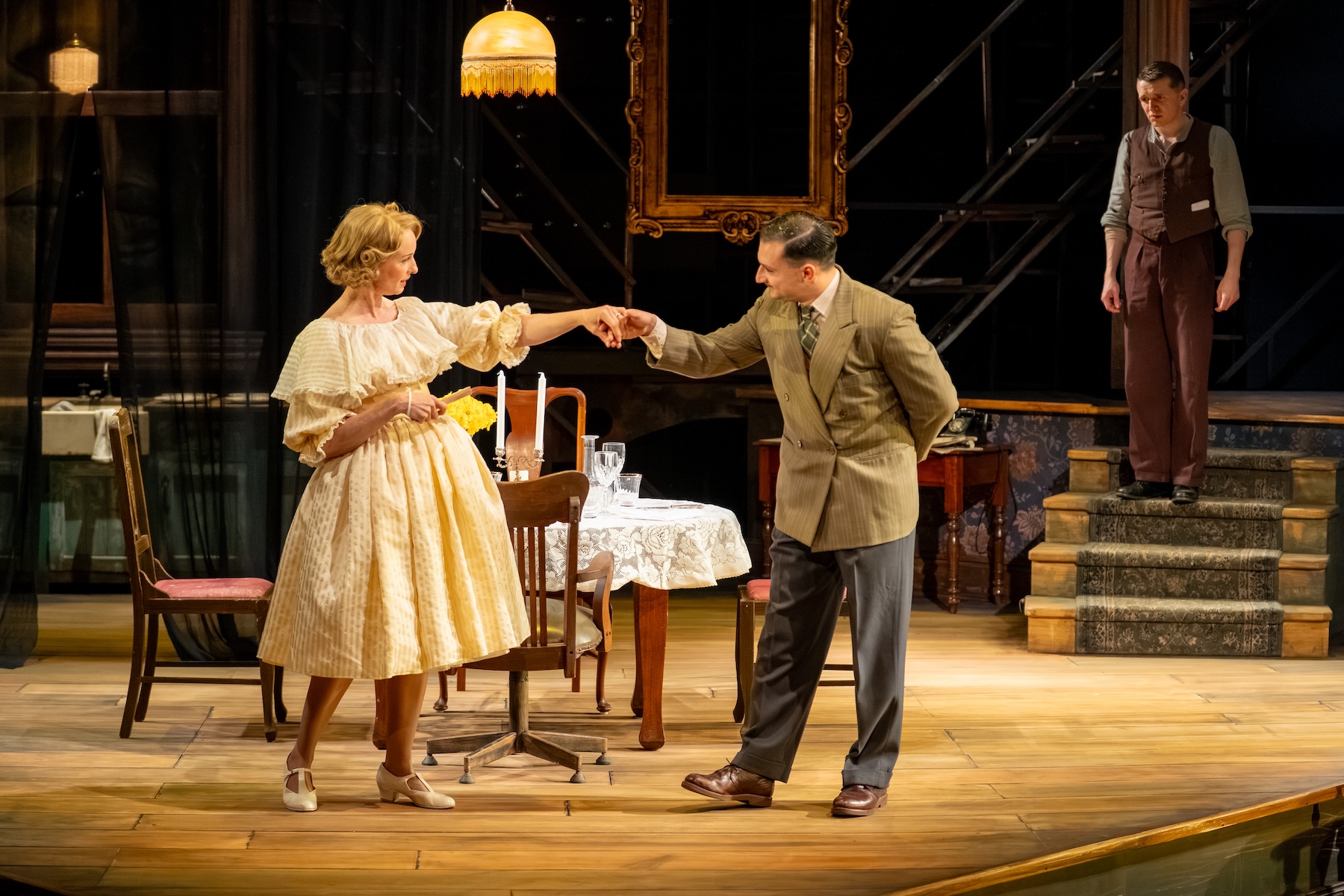 Mark Thompson’s set is remarkably placed with gorgeously worn floorboards, antique flowered couch and plush-upholstered dining chairs, and what looks to be stencilled lino surrounding the stage. There’s a terrace attached to the fire escape, where Tom goes to smoke and look out to the rest of the world, where his dreams lie. There is no set change, and this responds well to the subtle, domestic nature of the play’s telling.