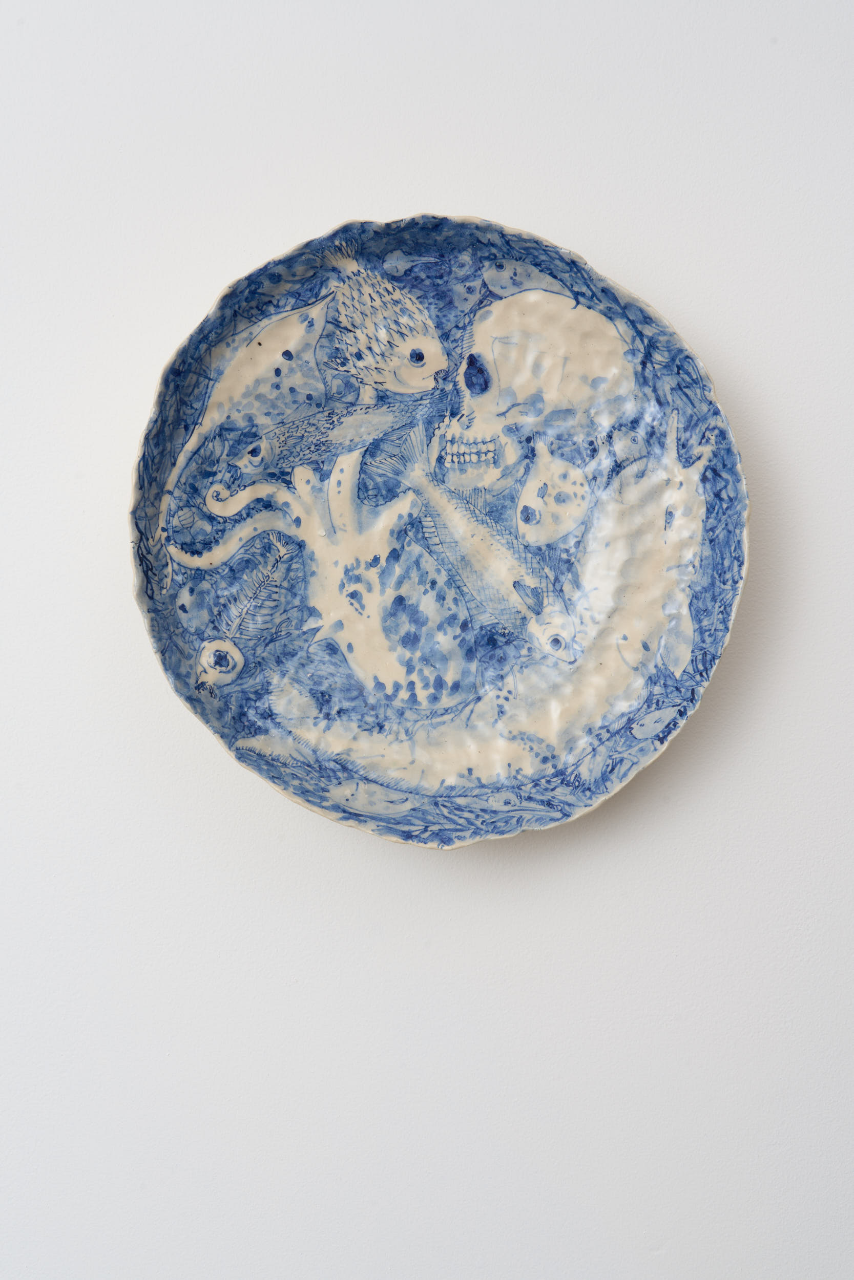 Gerry Wedd’s ceramics may be domestic in scale, but they are gently (and occasionally not so gently) subversive in intent. His series of Bloom cups bear delicately painted depictions of dying or dead marine creatures and skeletons. Even in such simple objects, through his skill in underglaze painting he instils a sense of pathos and loss. The more ambitious new work in this exhibition comprises two magnificent mid-fired ceramic jars and six shallow porcelain dishes. In this body of work Wedd references the enduring themes of the still-life genre, known in French as ‘Nature Morte’ (Dead Nature), namely the transient beauty of life and ever-present mortality. These pieces reveal Wedd’s mastery of cobalt blue underglaze painting to achieve both linear fluidity and the translucent tonal nuances of watercolour. In one of the dishes, Deadpool, a mermaid or selkie floats lifeless amidst a crowded composition of marine creatures, reminiscent of the piles of dead sea life washed up along the coastline in recent months. In another, Bloom, the composition includes a grimacing skull, referencing the ‘Vanitas’ still-life tradition in which a skull or other symbolic reminder of death is part of the composition.