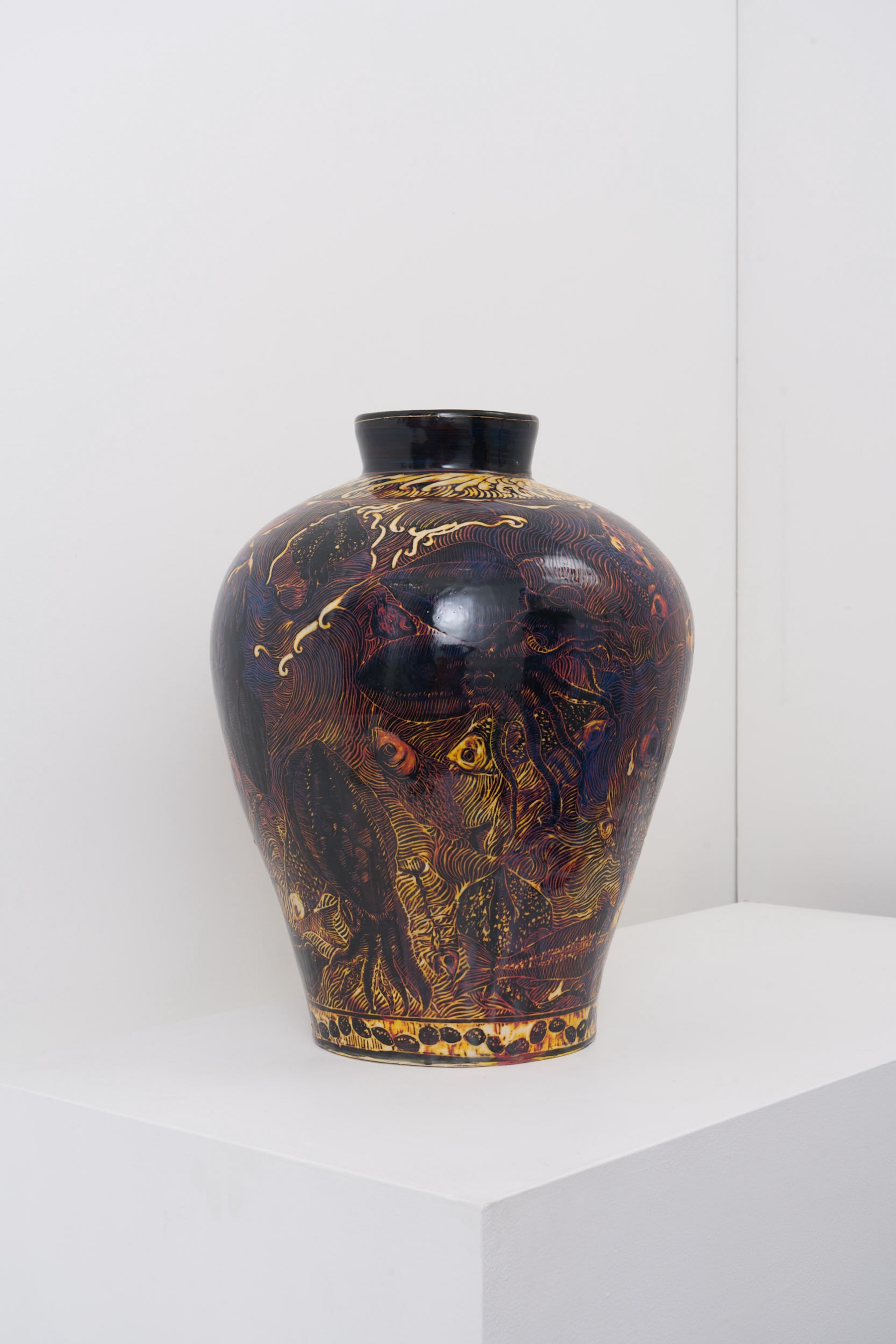 The masterworks in a show in which there is no weak link must be Wedd’s two large jars, Big Bloom, with its complex blue and white underglaze painting, and the ominous Red Tide. In this latter piece, dense sgraffito markings are scratched through poured layers of creamy yellow, black and a deep blood-red slip to create shifting transitions of colour. Through this layering, scratching and painting Wedd has achieved a dense, complex composition of marine creatures swirling in the ocean current around the rotund form. Red Tide is an important work of art, a mourning vessel for the environmental tragedy that has left its mark on many South Australians.