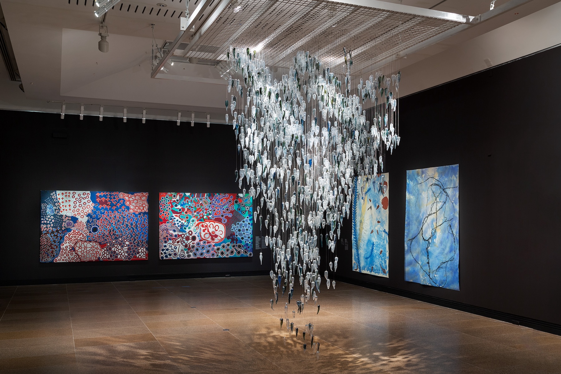 Yhonnie Scarce’s installation, Thunder Raining Poison, which was showcased at the inaugural Tarnanthi Festival in 2015, also references Maralinga. This work is part of the National Gallery of Australia’s collection, but it was important to include it in this exhibition because it was specifically commissioned for the 2015 Festival. Scarce, who was born in Woomera, has a profound understanding of the impact that the tests had on Aboriginal people. She created this remarkable installation, featuring 2,000 individually blown glass bush yams, to symbolise one of the bomb clouds dissipating.