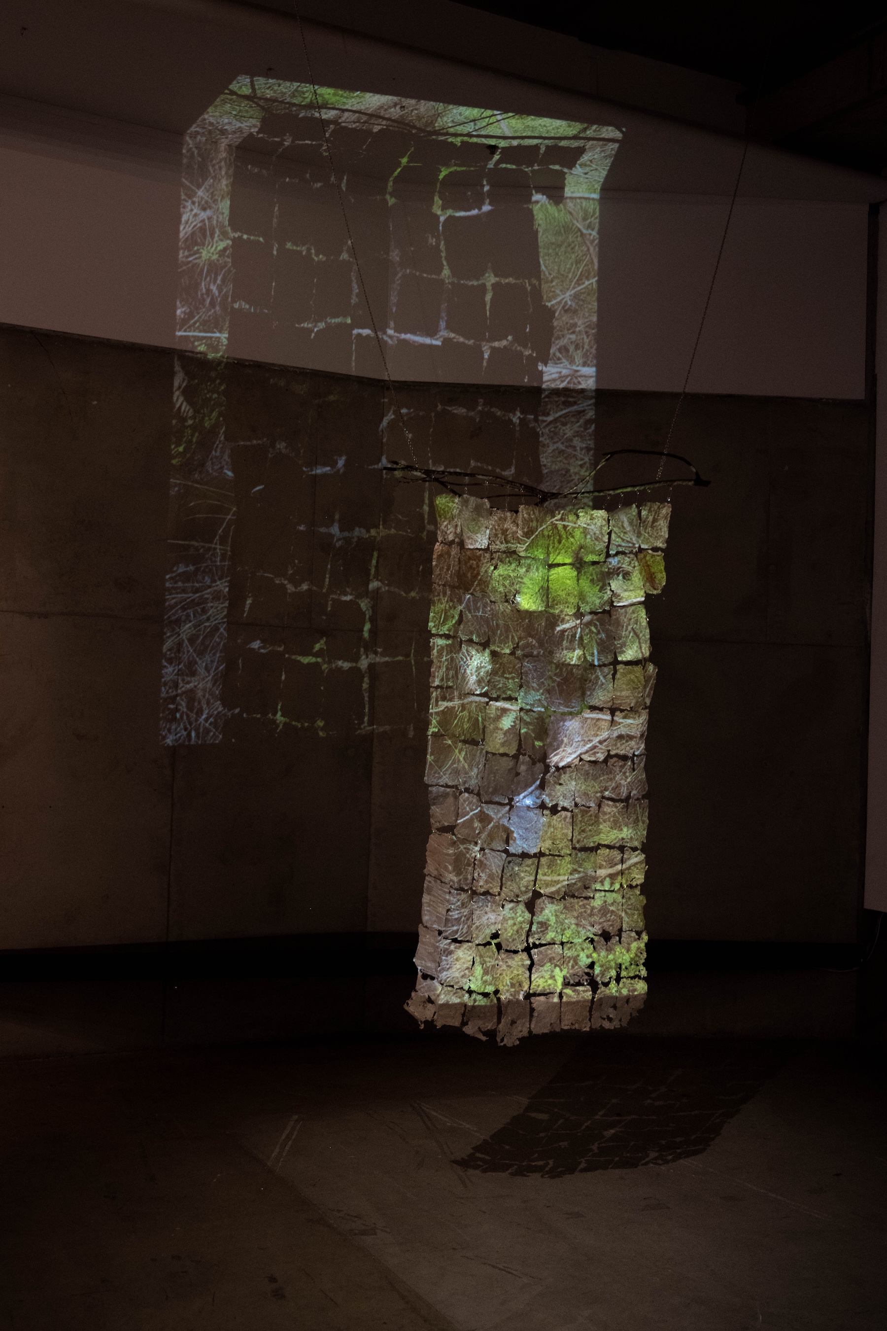 Frankie Acacia’s installation work nettle memory is also captivating. The artist uses stinging nettles to create delicate, translucent paper. Each piece is similar in size to a mobile phone and is hung together with safety pins through which a video work is projected. Acacia takes this hostile plant and repurposes it into a delicate and beautiful product. The video projection features imagery from the artists’ community examining what it means to be queer. Acacia is looking at ways of archiving through everyday materials and it’s extremely effective.