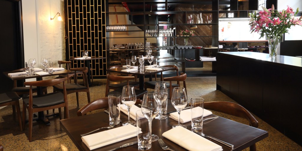 It is a simple and sparse set-up: a bar runs along one wall of the split-level front-of-house, while black boards display a bar menu and wine specials. An exposed corrugated-iron roof and joists, hanging lights, concrete floors and bare brick give the bar area a modern, industrial feel.