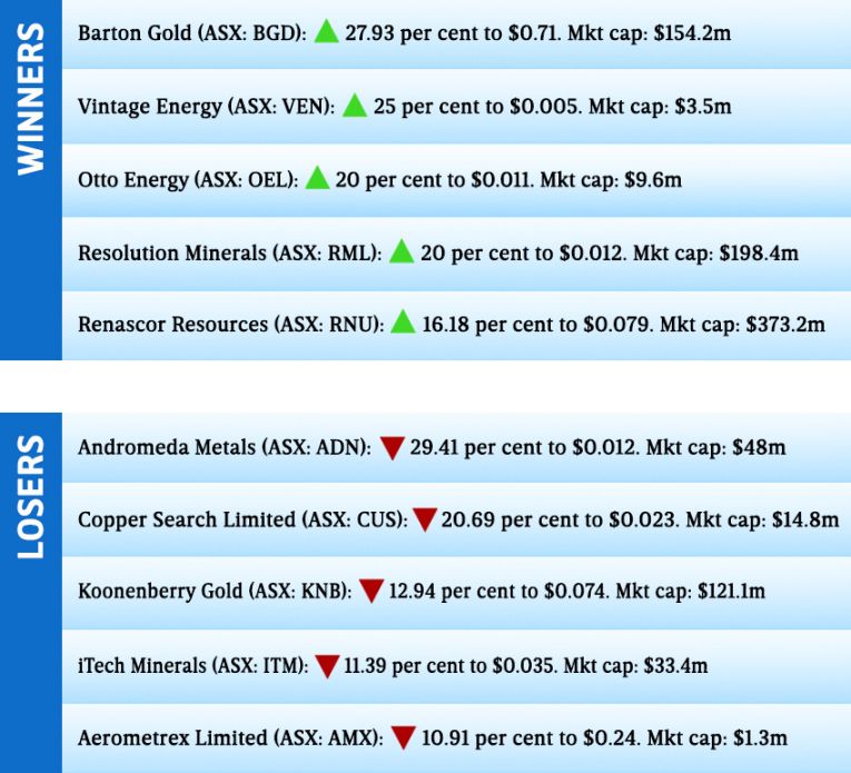 There was no major news from the week’s Winner, Barton Gold, which surged 28 per cent higher as investor support for gold stocks remained strong.