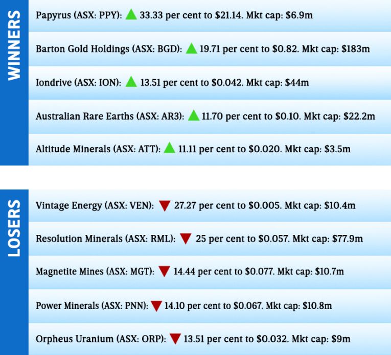 Papyrus was the big Winner, though, after an August 4 capital raise, beating out Barton Gold, which enjoyed the higher gold prices and announced some company-specific news about tenements.