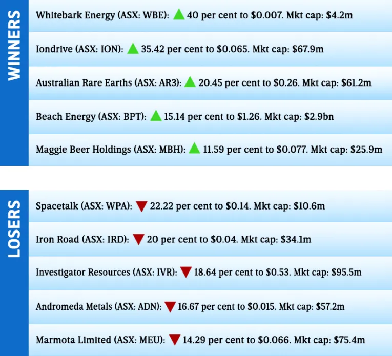 There was little news from the Losers, but Spacetalk fell 22.22 per cent, Iron Road by 20 per cent and Investigator Resources by 18.46 per cent.