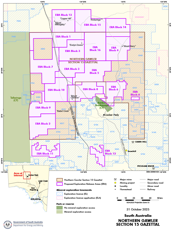 The 16 parcels of land in the Northern Gawler Craton, near Coober Pedy, will be available for competitive tender in February next year.