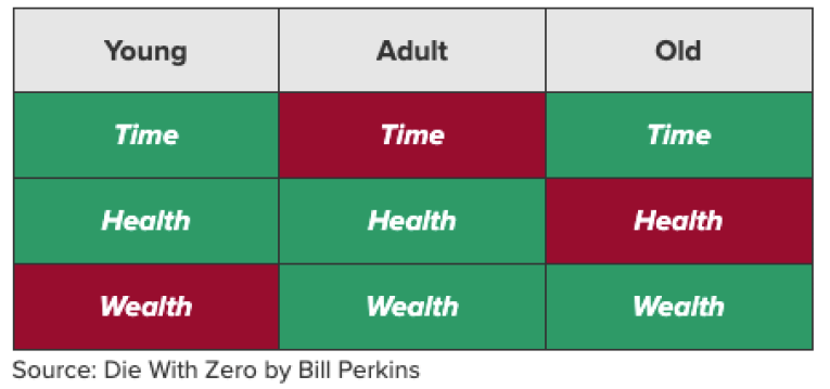 Bill Perkins, author of Die With Zero, discusses the concept of the “three currencies” we trade throughout life: money, time, and health. Rarely do we possess all three in abundance at once. In youth, we have health and time, but little money. In older years, we may finally have money and time, but health begins to limit what we can do. The same pattern often applies to our children—they benefit most from financial support during their early life-building years, not decades later when the window to make the most of it may have passed.
