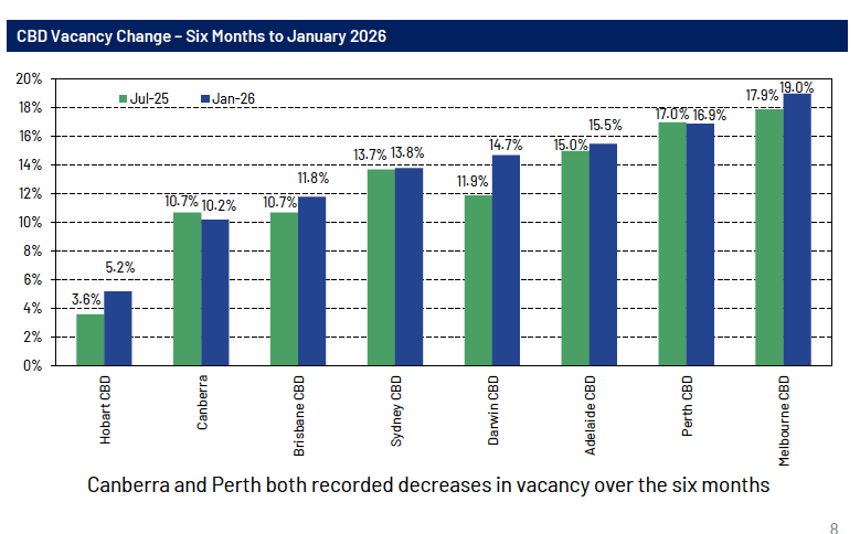 The Adelaide CBD vacancy rate was just above the national average, which also increased by half a per cent to 14.8 per cent in the six-month period to January 2026.