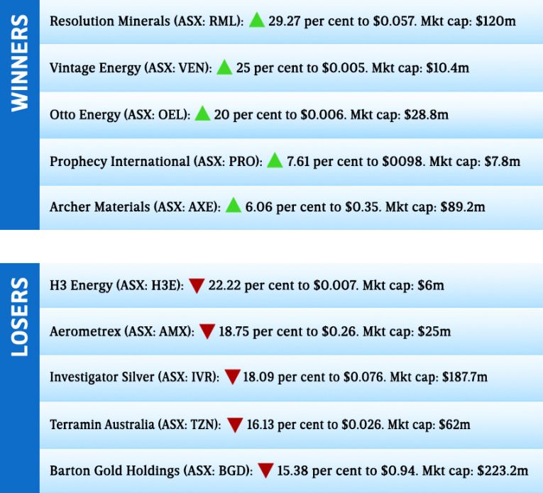 The top Winner for the week was Resolution Minerals, which rose by 29.27 per cent over the five trading days despite no major announcements.