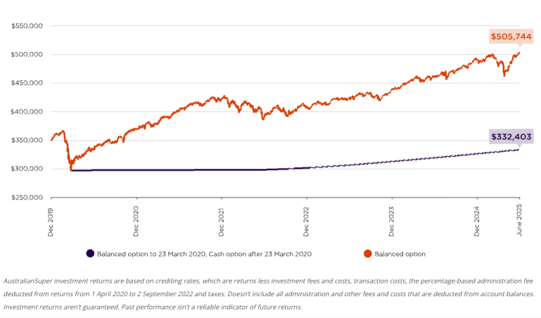 To highlight this, AustralianSuper provided the following example. It shows someone who switched from their balanced option to cash when Covid hit and markets originally crashed. As you can see, the Balanced option quickly recovered and just over five years later the difference is $173,341 (from a starting balance of $350,000).