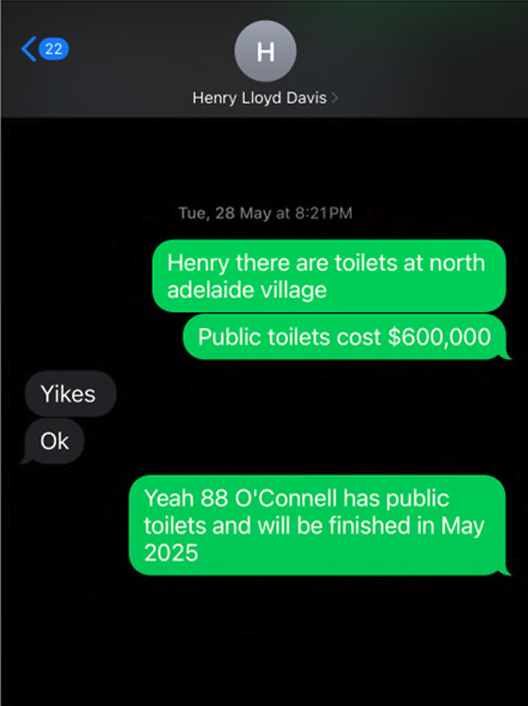 The text exchange that started the drama occurred on May 28, 2024, following a council decision about possible street upgrades, including public toilet facilities in North Adelaide’s Lombard Street.