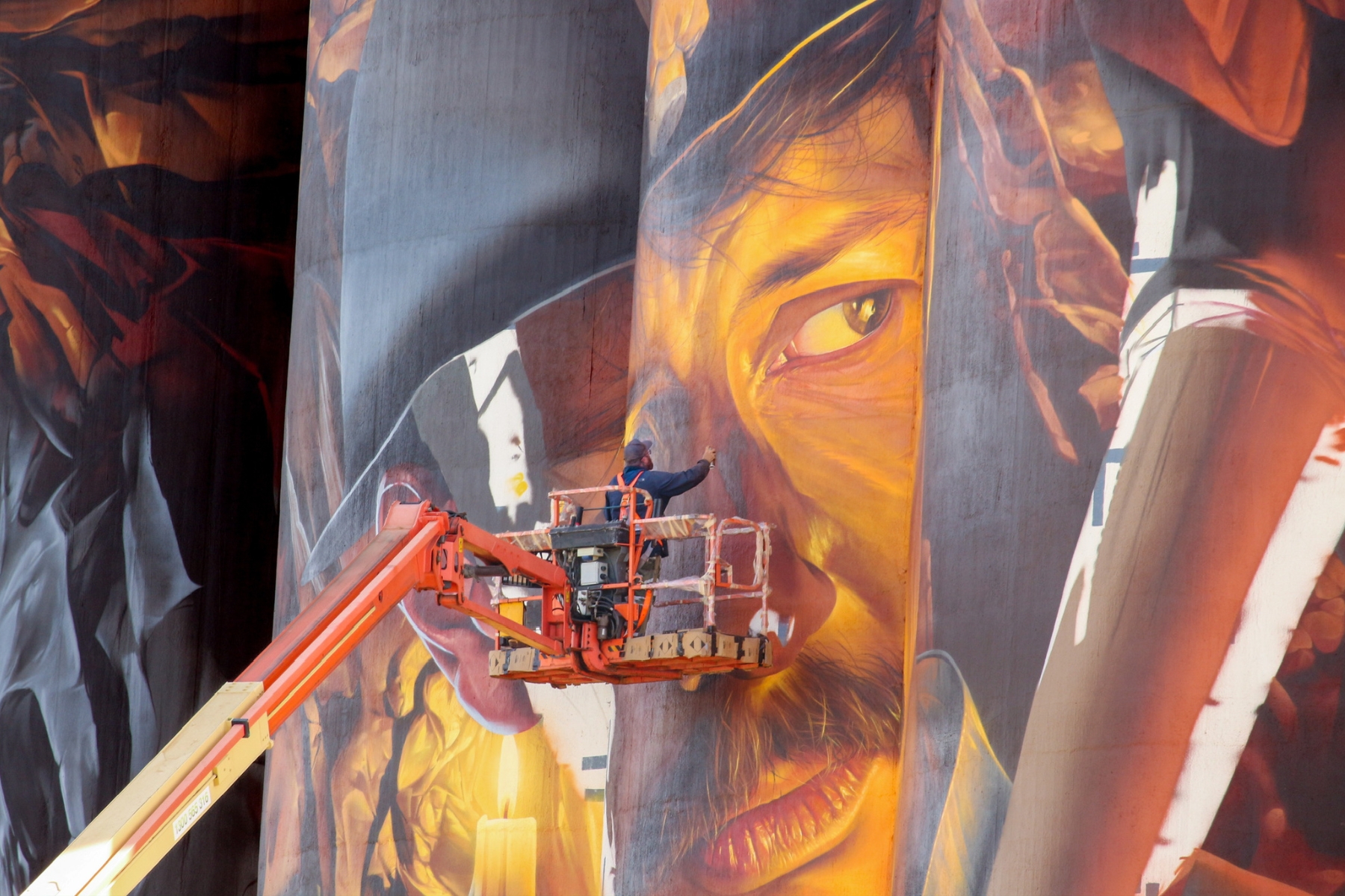 After more than five weeks of painting through rain, hail, and shine, Smug One’s mural is an ode to the region’s copper miners of the 1840s, giving viewers a glimpse of the harsh conditions miners faced.