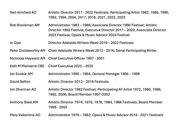 It was signed by Brookman, former Writers’ Week Director Jo Dyer, former Writers’ Week chair Peter Goldsworthy AM, and other former directors and executives including Neil Armfield, Nicolas Heyward, Kath Mainland, Ian Scobie, David Sefton, Jim Sharman, Anthony Steel and Mary Vallentine.