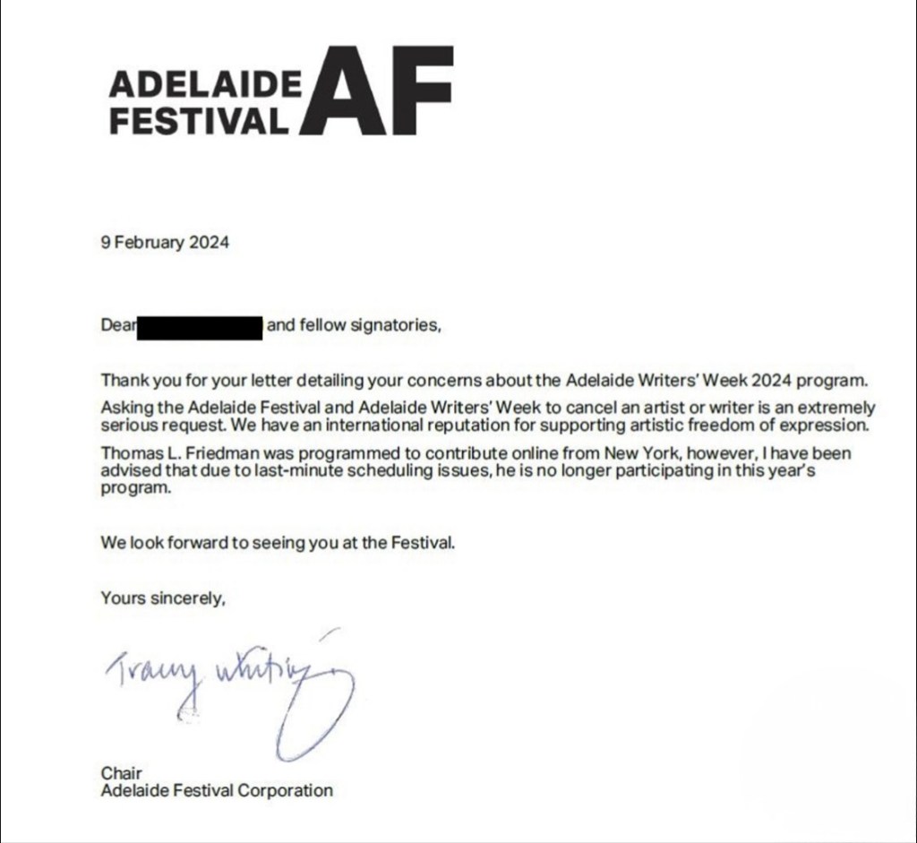 Friedman did not participate in the 2024 event “due to last-minute scheduling issues”, according to a letter sent by the Adelaide Festival Board Chair Tracey Whiting on February 9, 2024.