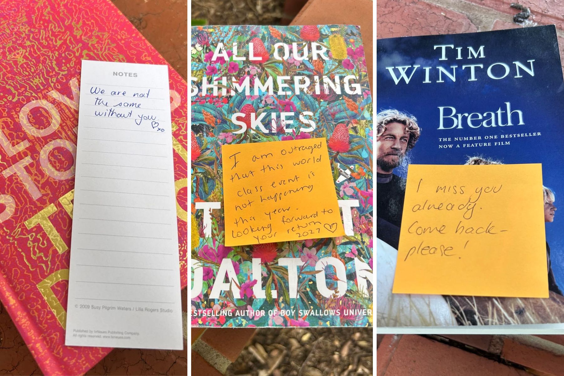 It comes as an “avid book lover”, who asked not to be identified, has begun leaving books at the Pioneer Women’s Memorial Garden – where Adelaide Writers’ Week is held – as “an act of protest”, saying that she and her friends “are feeling such a loss for our community and for our city, for the week that we have bookmarked into our annual calendars, year after year, and look forward to for months in advance”.