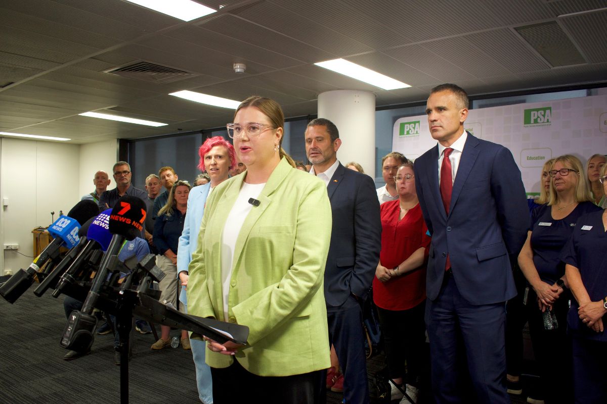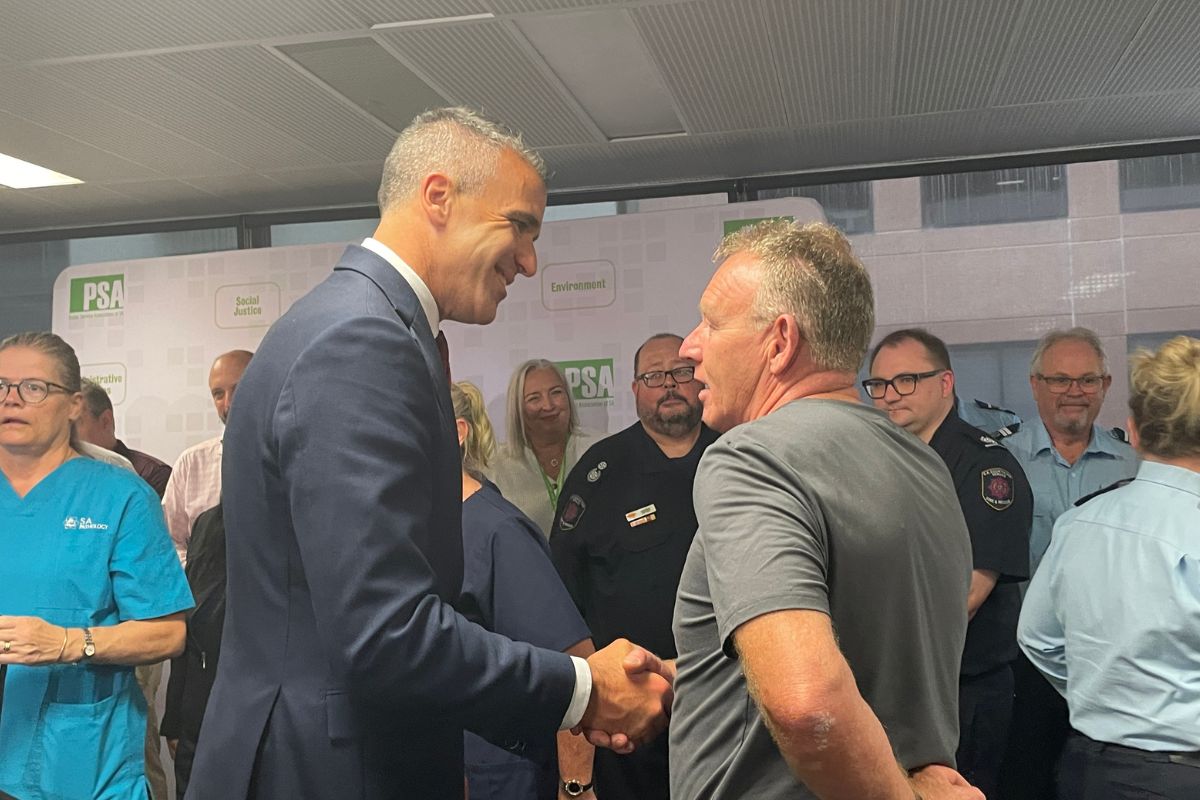 He was joined by Deputy Premier Kyam Maher and Public Service Association general secretary Charlotte Watson to announce the deal in front of public sector prison officers, health workers and more.
