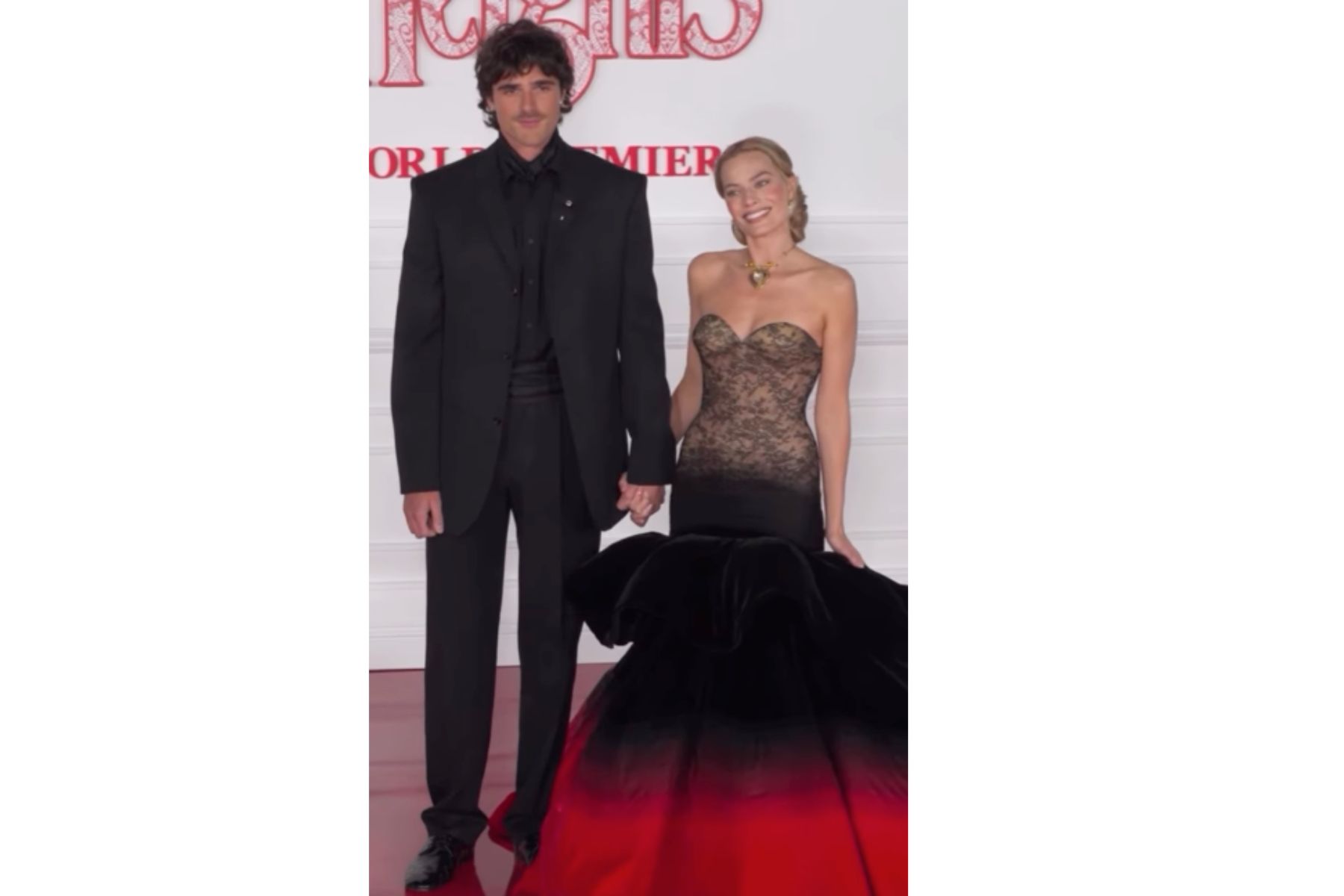 Robbie was seen on the red carpet smiling and holding hands with her co-star, Australian actor Jacob Elordi – who was dressed in an all-black suit and black shoes.