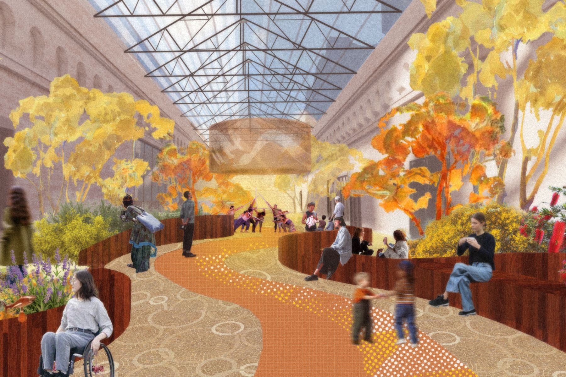 This would give Tandanya the chance to rethink how artwork and exhibitions could be displayed in the space. More native plants fill the room, and the roof would be replaced with a glass ceiling.