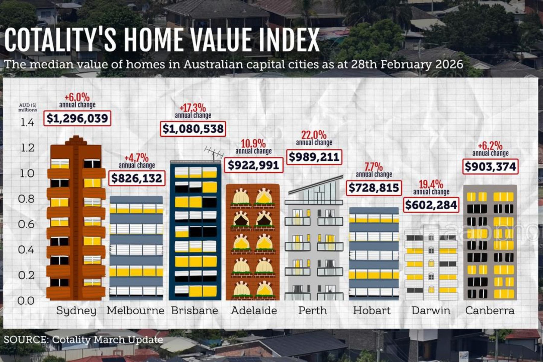 Dwelling values climbed 2.3 per cent in February alone, adding more than $22,500 to the median home.
