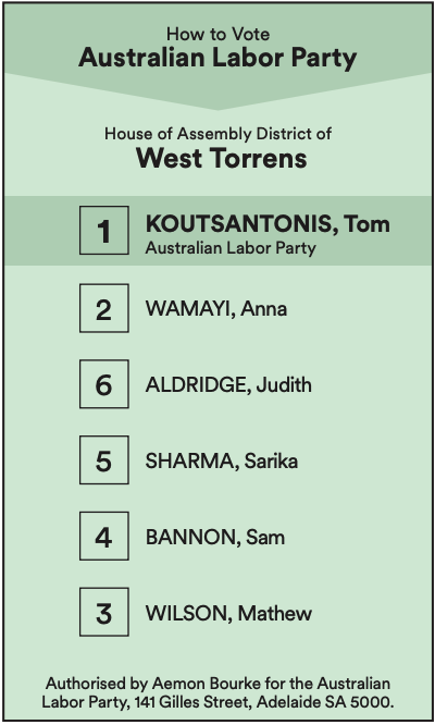 In the seat of West Torrens, held by Treasurer Tom Koutsantonis, his ‘how to vote’ card in the lower house recommends ranking candidates from the conservative Family First and the Australia Family Party in the second and third spots, above the Greens in fourth. In the upper house, the Greens are preferenced second.