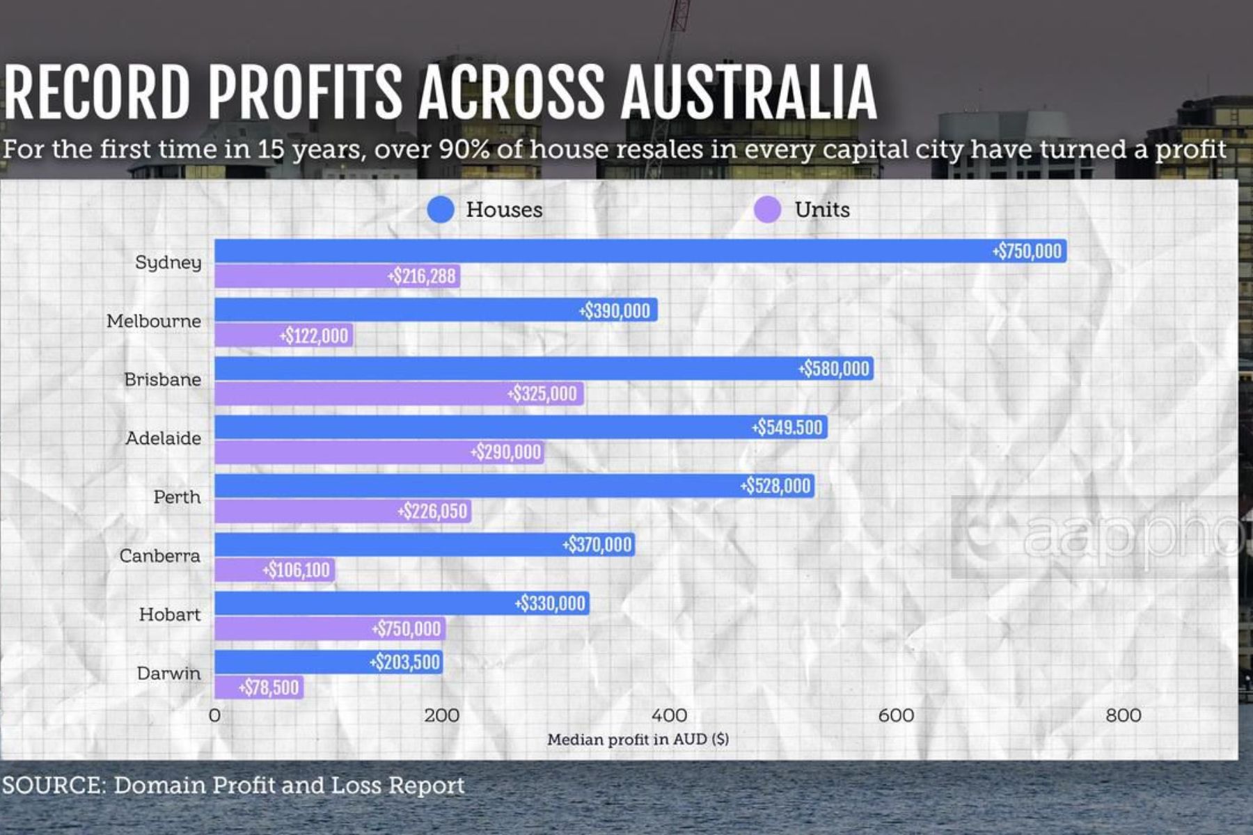 Units were also making record profits, but a median windfall of $228,000 nationally was significantly slimmer than $440,000 for houses, and the property group was more likely to make a loss, with 11 per cent selling for less than their buying price.