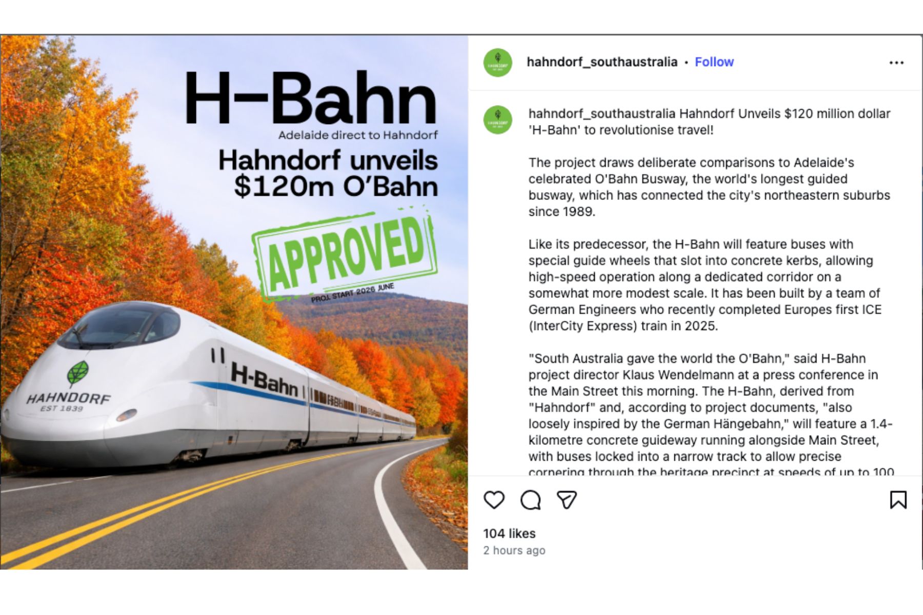 An Adelaide Hills town struggling with its unique set of traffic issues appeared to be leaning in to its German roots this morning. The Hahndorf social media page announcing its tongue-in-cheek $120 million dollar “H-Bahn” to revolutionise travel.