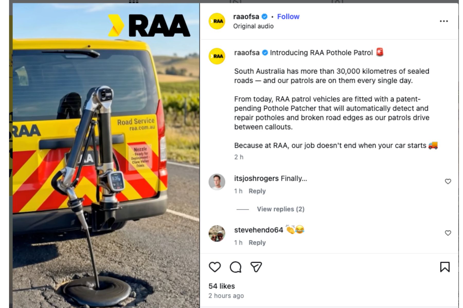 “From today, RAA patrol vehicles are fitted with a patent-pending Pothole Patcher that will automatically detect and repair potholes and broken road edges as our patrols drive between callouts.”