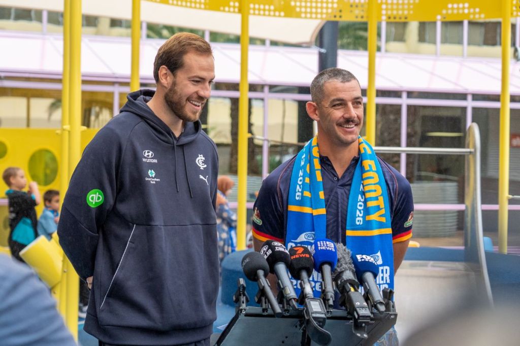 Carlton forward Harry McKay and Crows veteran Taylor Walker joined AFL CEO Andrew Dillon and Premier Peter Malinauskas at the Women’s and Children’s Hospital on Wednesday morning to visit young footy fans who would not be able to make it to tonight’s clash at Adelaide Oval.