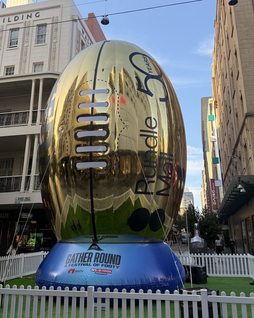 Once footy fans have gotten the all-clear in Rundle Mall between matches, the shopping thoroughfare is full of DJs and activities like trick shot challenges, scavenger hunts and a claw machine giving shoppers a chance to win a golden football.