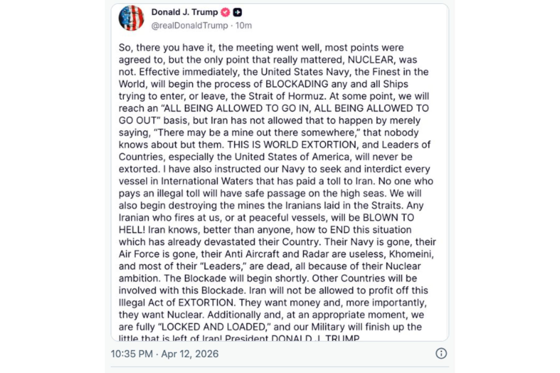 Trump said on social media he told the navy to “seek and interdict every vessel in International Waters that has paid a toll to Iran”.