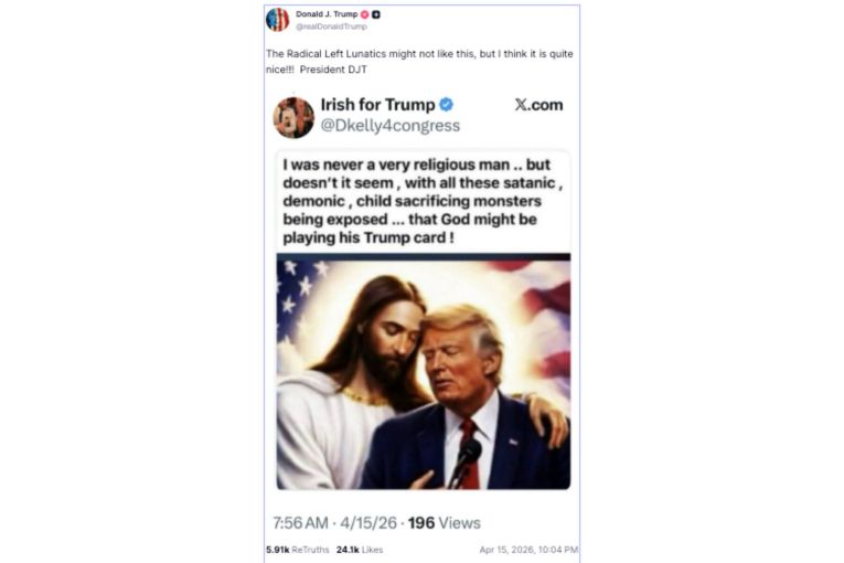 The image, reposted to Trump’s Truth Social account, shows Trump with his eyes closed, touching temple-to-temple with a similarly posed Jesus. Trump is standing behind a microphone, and behind him is an American flag.